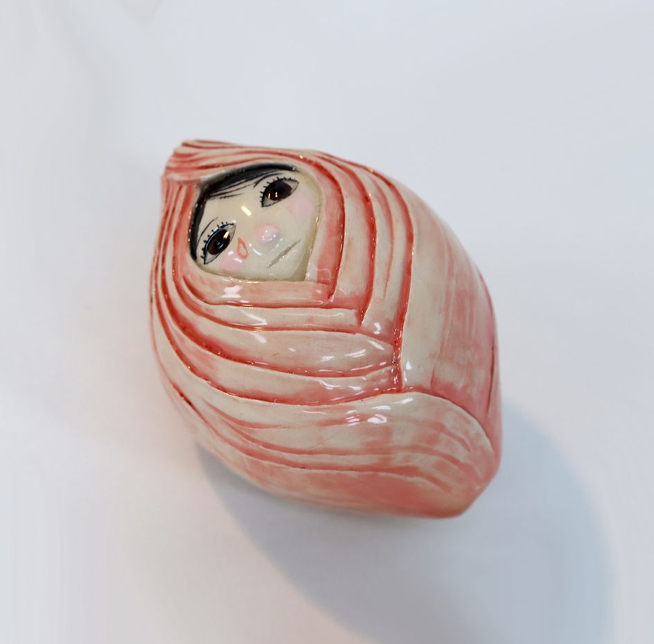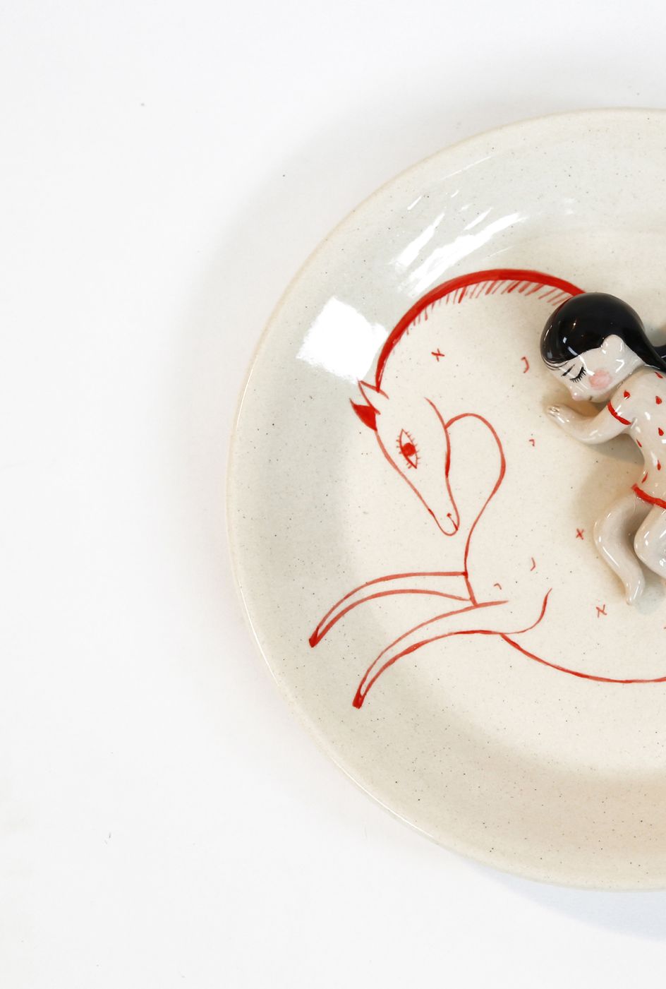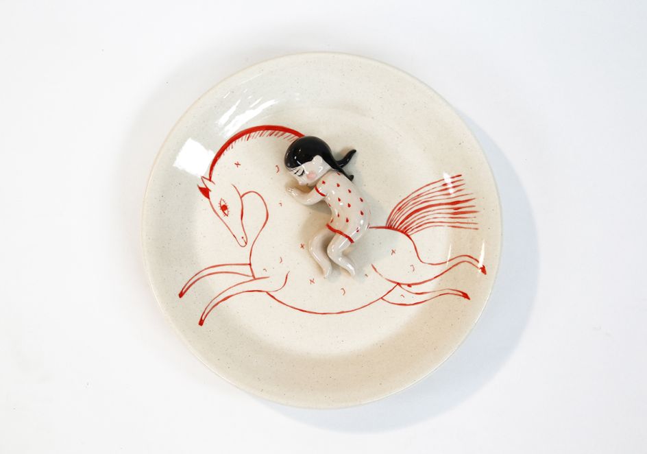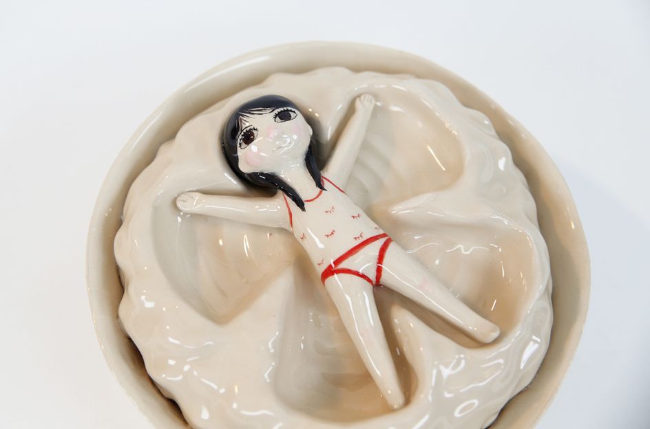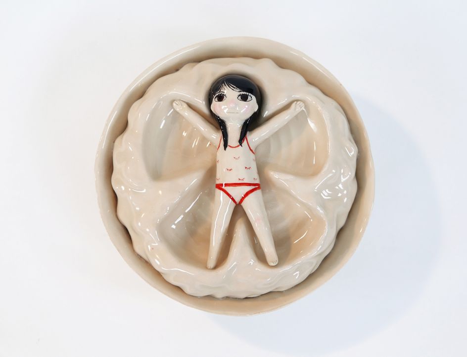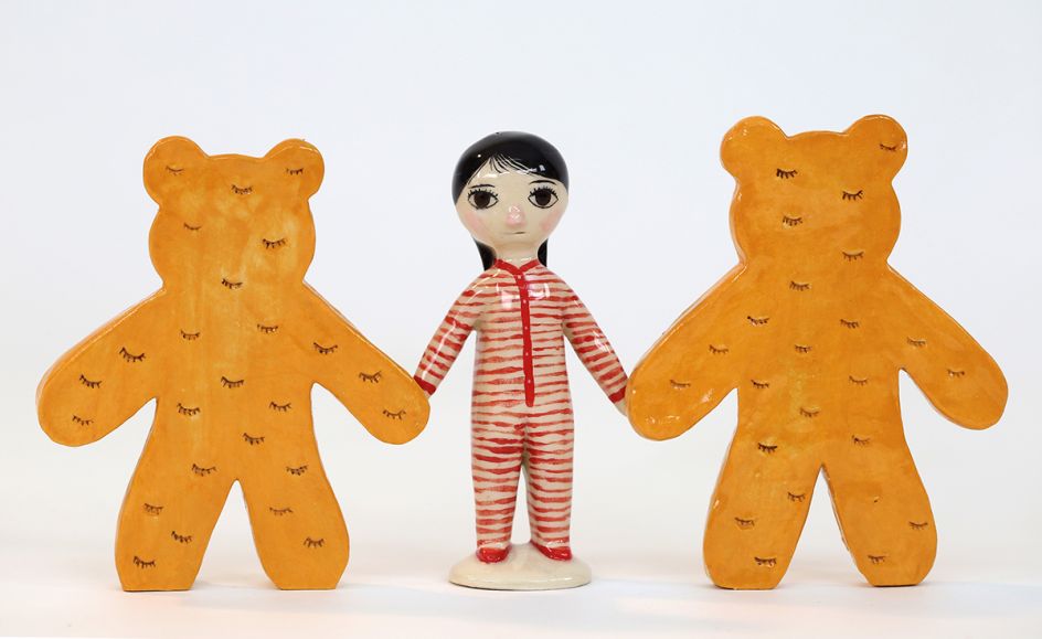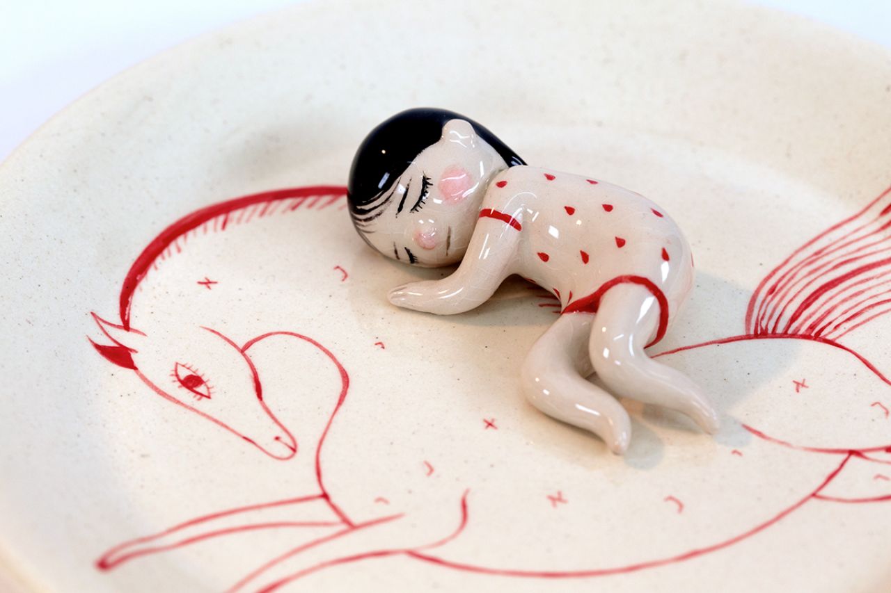 Most recently, the artist has experimented with clay – a medium currently enjoying a fierce resurgence in the art world – crafting delicate sculptures of little girls living in an imaginary world.