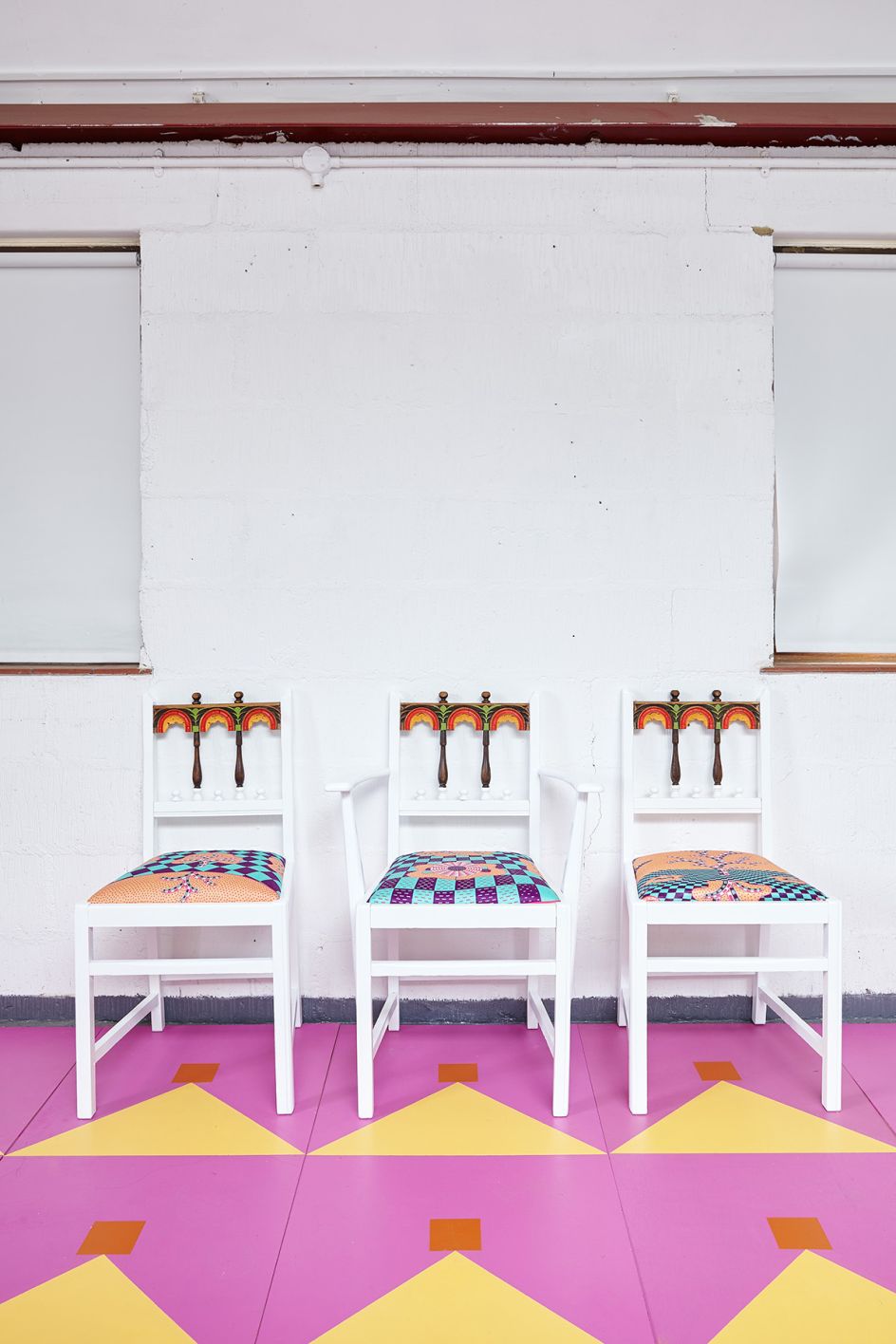 The chairs are sourced from charity shops, second-hand shops, skips – you name it, I'll find them anywhere. I mean, sometimes you might see me with two or three chairs in my hand, walking down East London trying to get on a bus because I'm always bumping into chairs! If you do see me with chairs and I look like I'm struggling, I'd really appreciate your help.