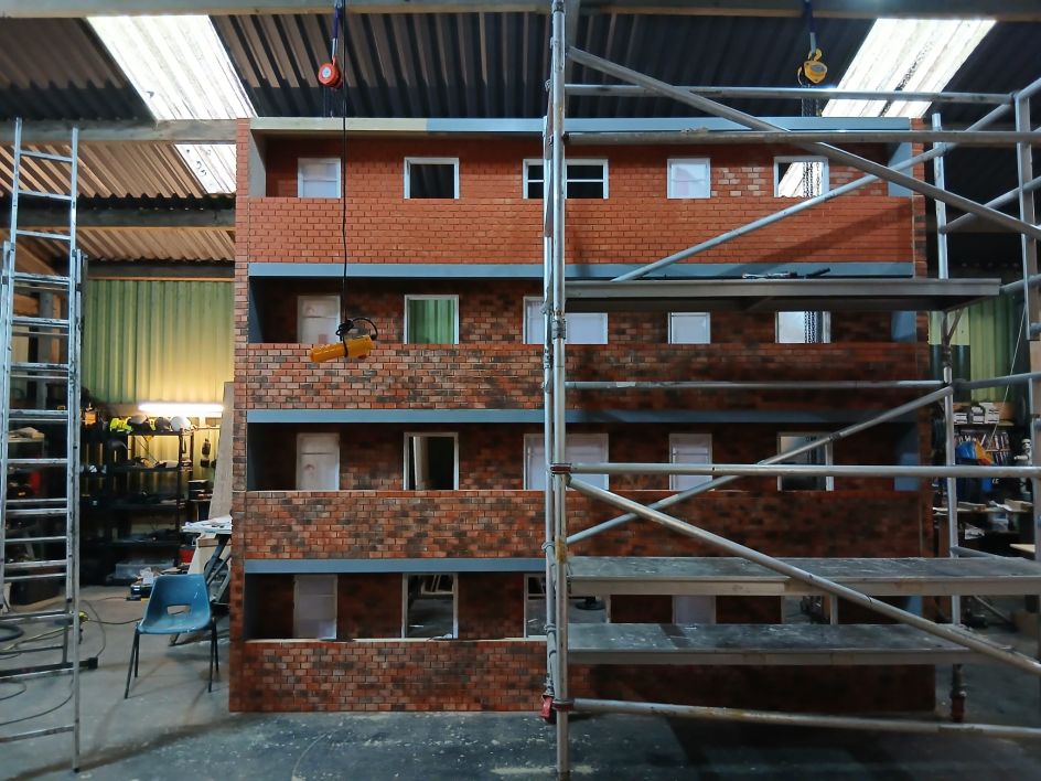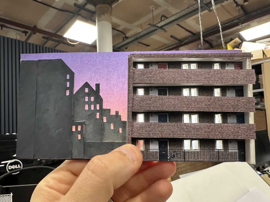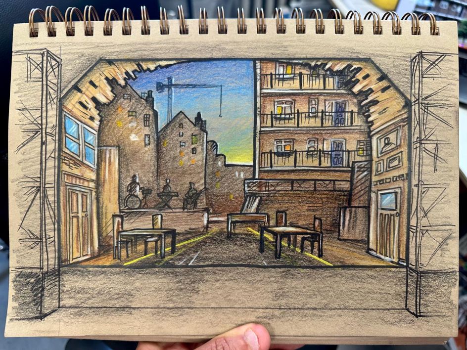 Moving from thrust staging to a proscenium end-on configuration at the Marylebone meant Yoav had to reimagine the spatial dynamics entirely. His solution was to open out the world with a smashed wooden arch and metal portals, placing the East London block of flats from which the characters are being evicted directly on stage.