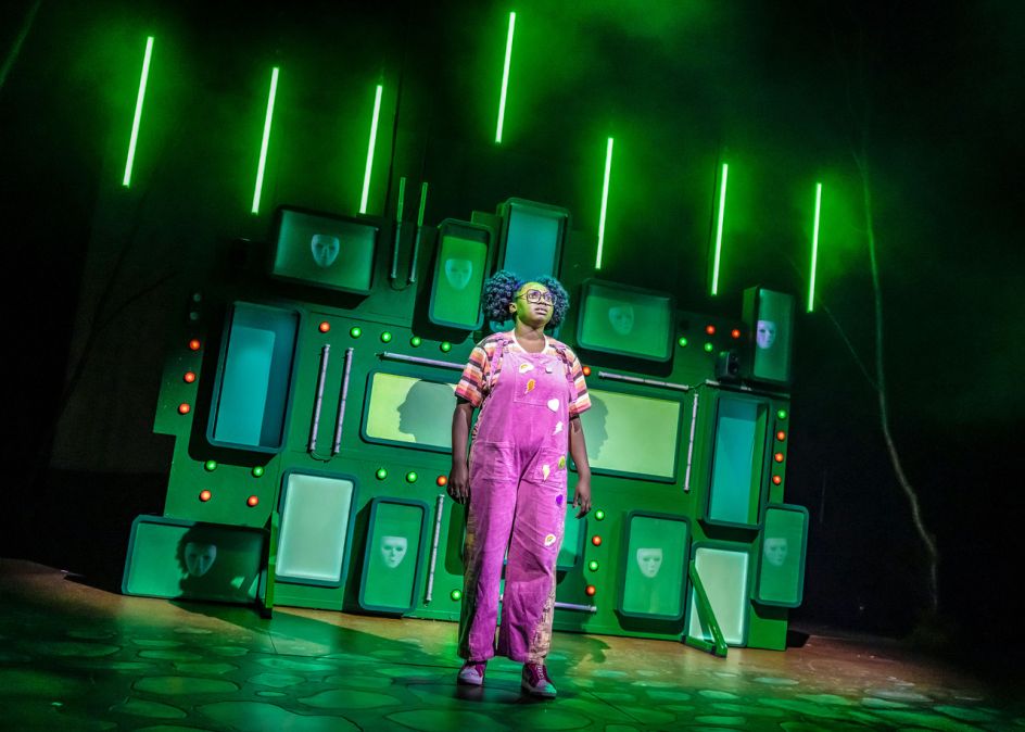 Yoav's design for The Wizard of Oz at TBTL in Keswick, directed by Sarah Punshon, shifts things into a completely different gear. A wall of mismatched screens glows emerald green, faces flickering across the monitors like digital ghosts. Where Pinocchio is organic and lush, this is industrial and eerie. But the underlying instinct is the same: create an environment that does dramatic work, not just decorative work. The screens aren't there because they look good. They turn the Wizard's world into something surveilled and unsettling; an Oz that feels contemporary and slightly sinister.