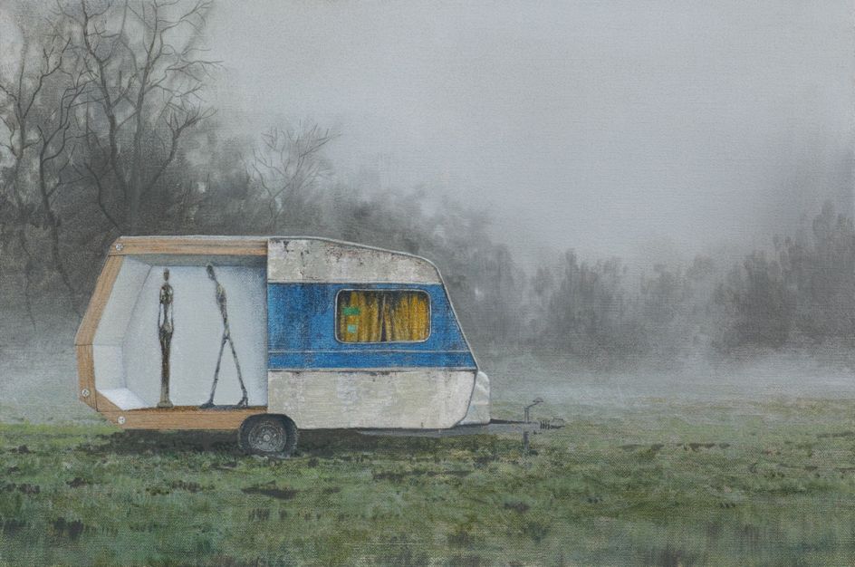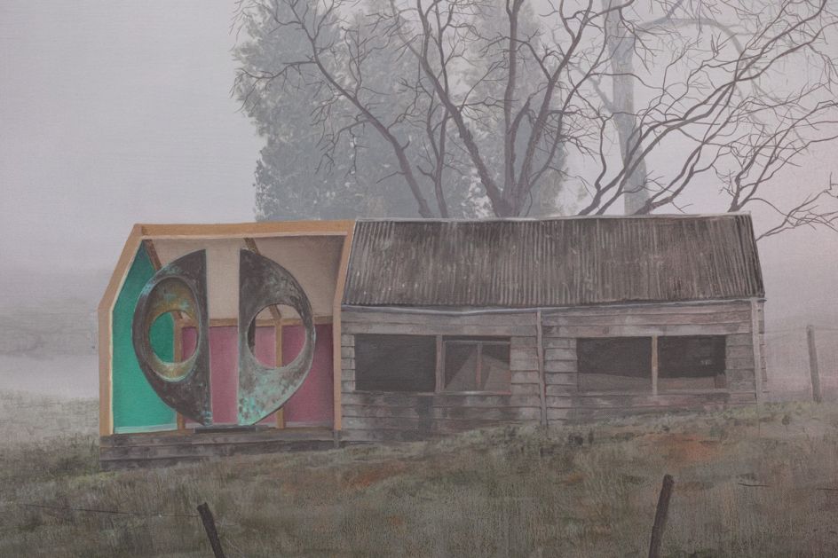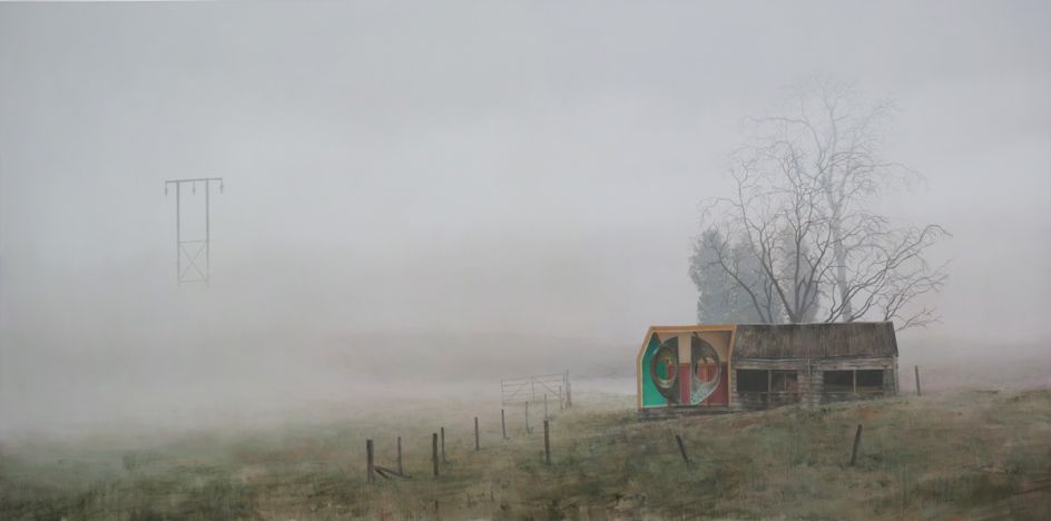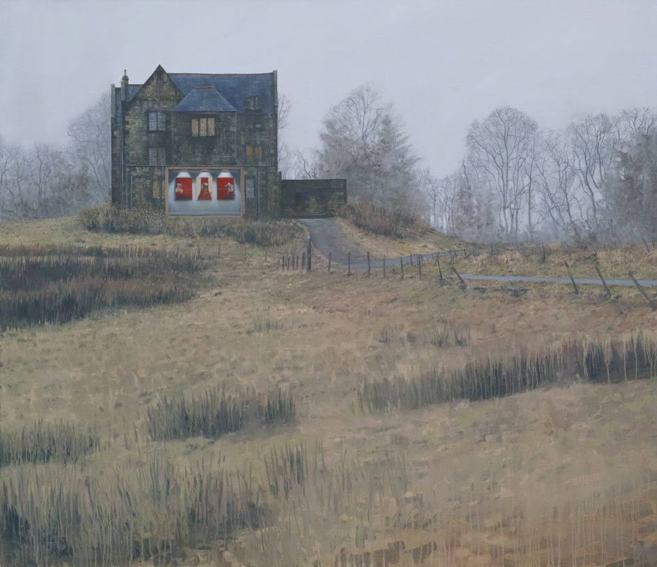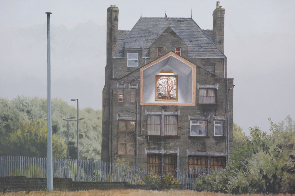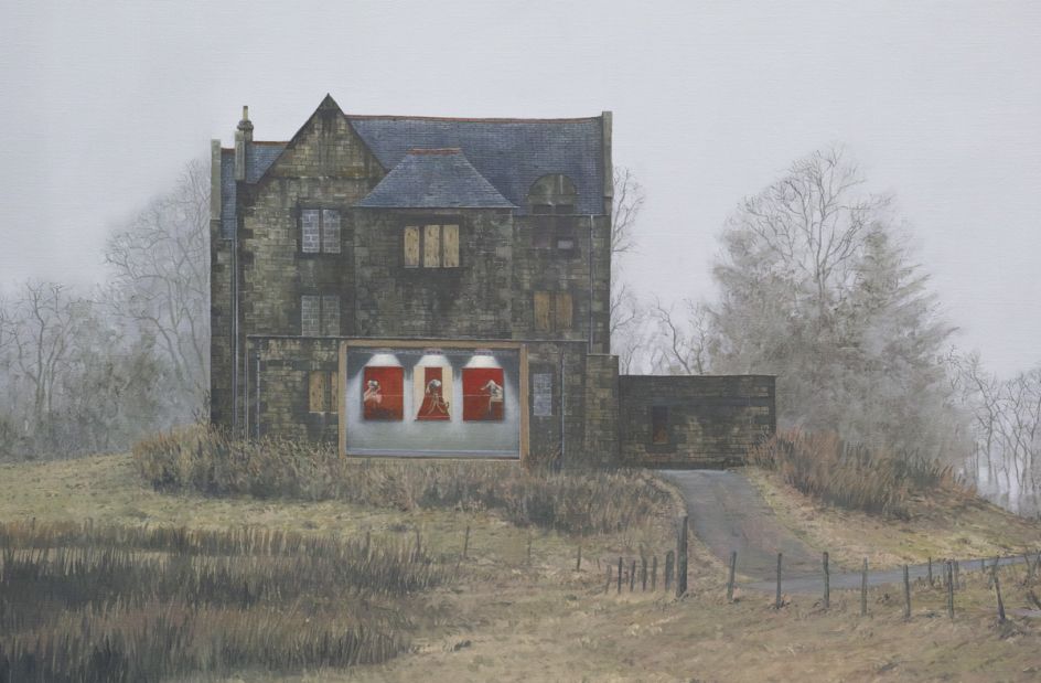 Scottish artist Mackie, featured previously, paints ethereal landscapes populated by isolated ageing buildings. But inside these structures, delicately and minutely reproduced, are some of the most iconic works from modern and contemporary art. Each relates to an artist argument; each is the fruit of friction. For example, one pair of paintings references the long-standing friendship between Lucian Freud and Francis Bacon that deteriorated into a spiteful tit-for-tat. Freud's 1989 “Standing by the Rags” appears in a crumbling Victorian building in Toxteth; Bacon's “Second Version of Triptych 1944” occupies an abandoned asylum near Glasgow.