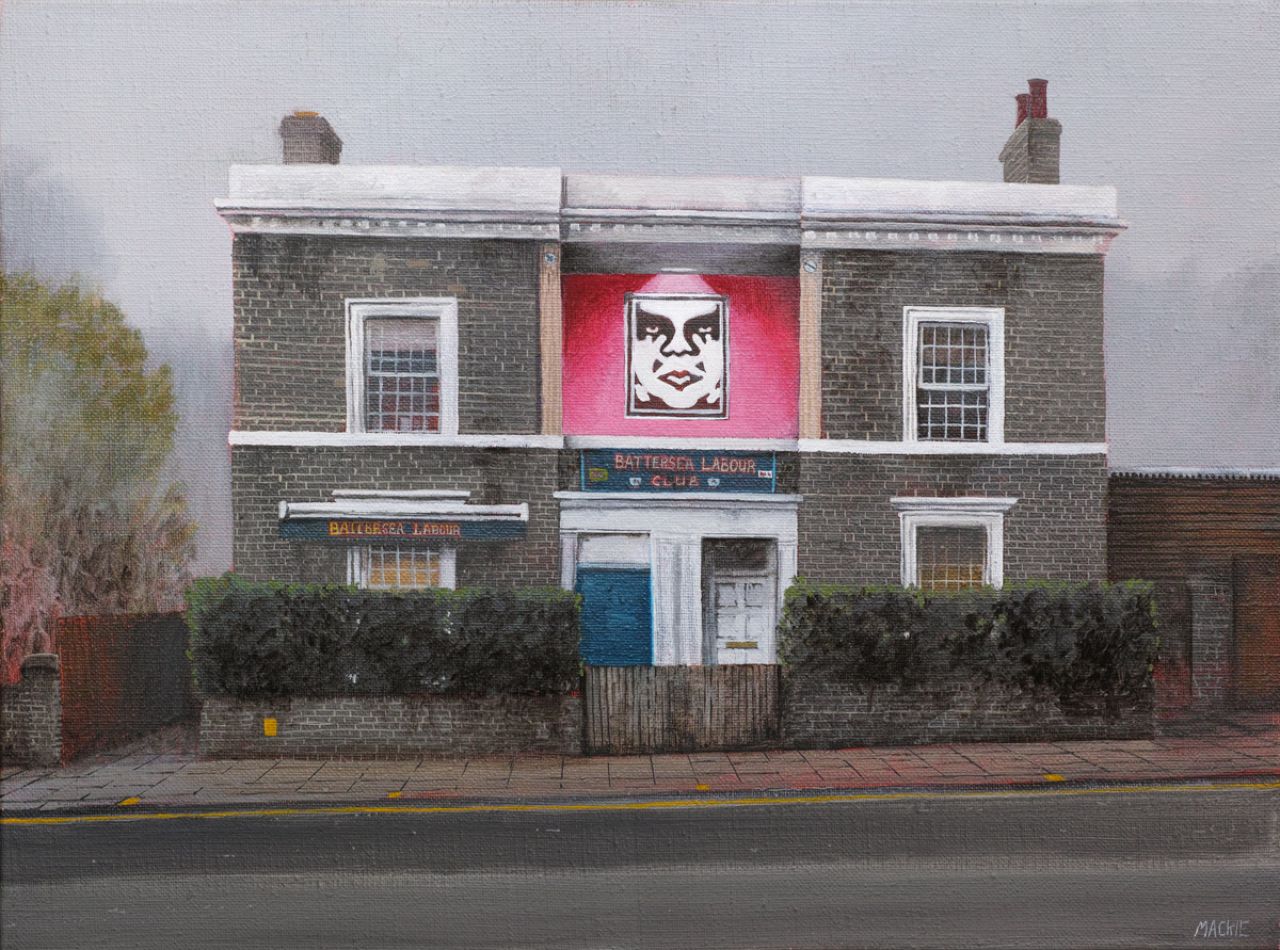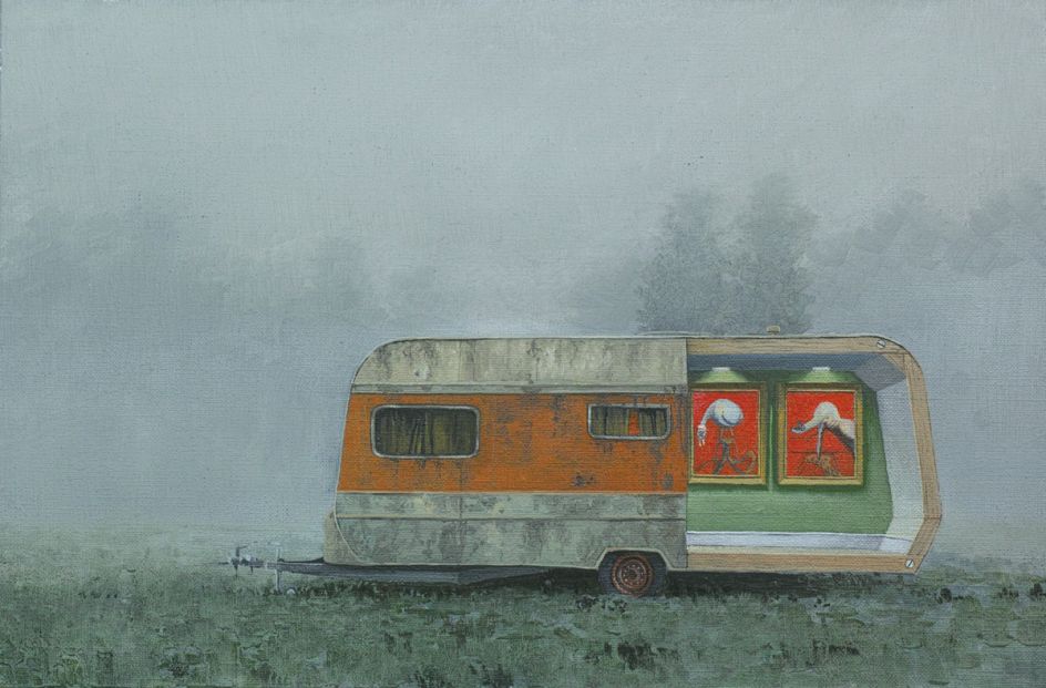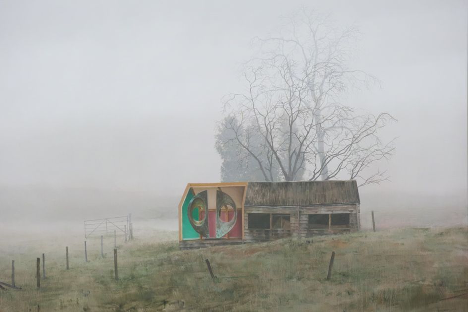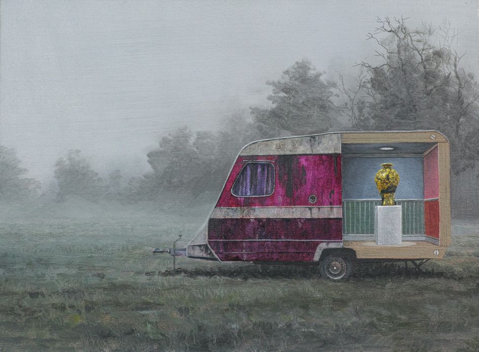Scottish artist Mackie, featured previously, paints ethereal landscapes populated by isolated ageing buildings. But inside these structures, delicately and minutely reproduced, are some of the most iconic works from modern and contemporary art. Each relates to an artist argument; each is the fruit of friction. For example, one pair of paintings references the long-standing friendship between Lucian Freud and Francis Bacon that deteriorated into a spiteful tit-for-tat. Freud's 1989 “Standing by the Rags” appears in a crumbling Victorian building in Toxteth; Bacon's “Second Version of Triptych 1944” occupies an abandoned asylum near Glasgow.