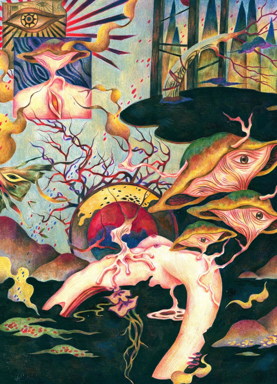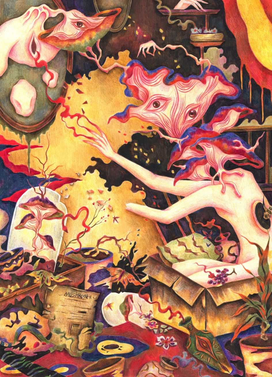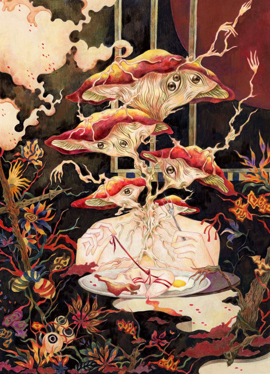 "Now and then, I struggle with my own negative emotions due to loneliness," she reveals. "In this project, I depicted the four different living environments of a mushroom woman. Through them, I wanted to show the process of the mushroom woman constantly fighting against her dark imprisonment."
