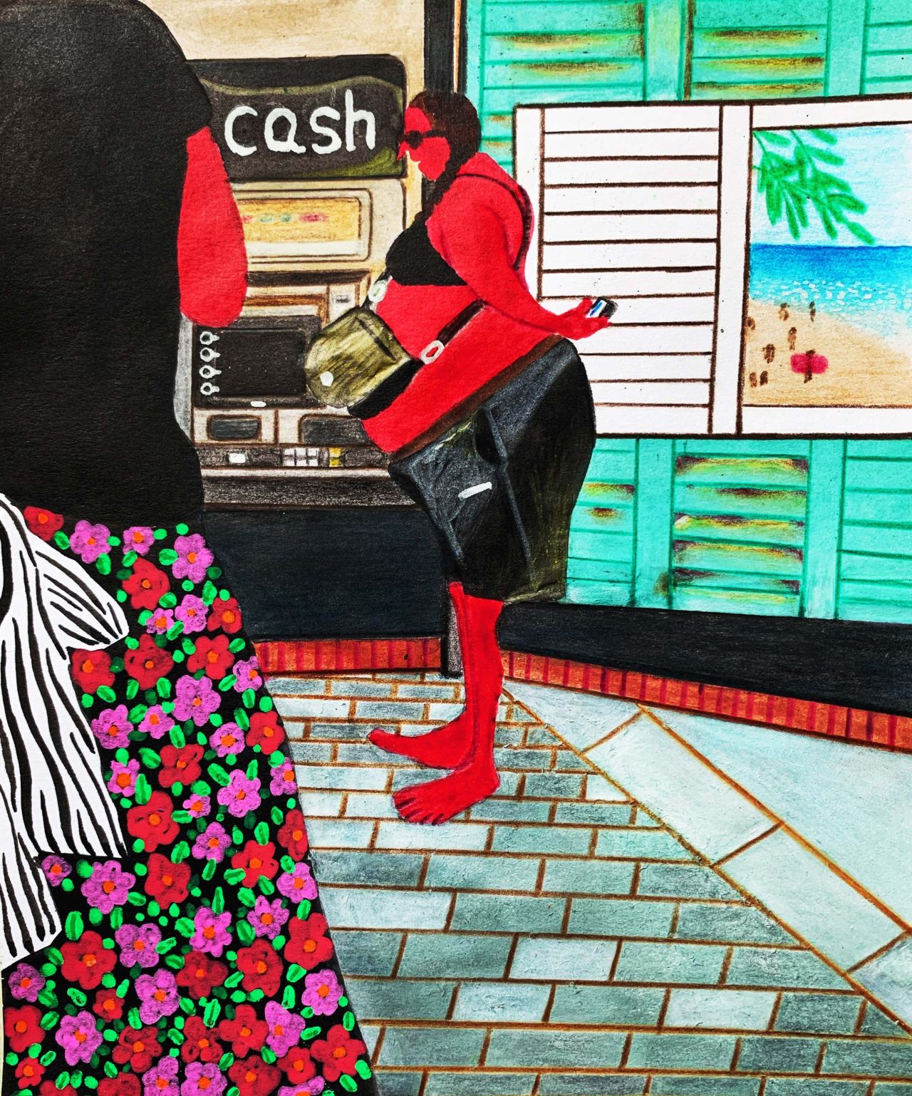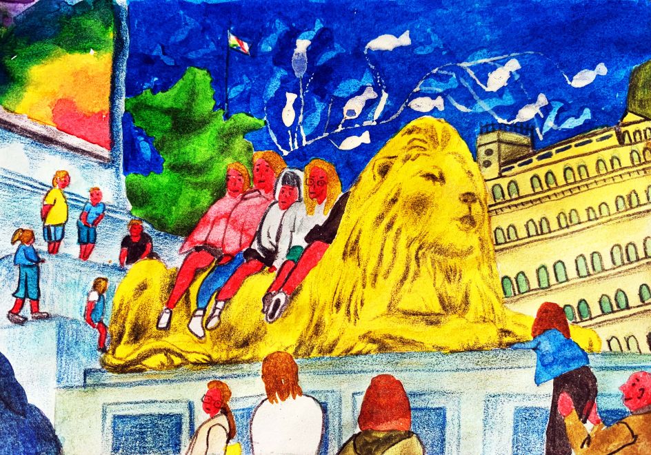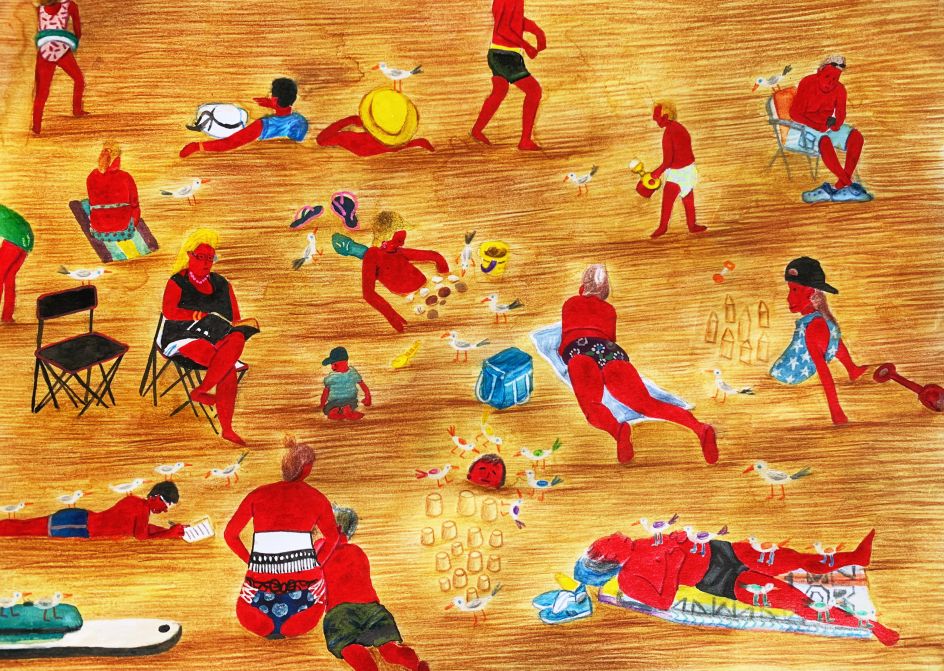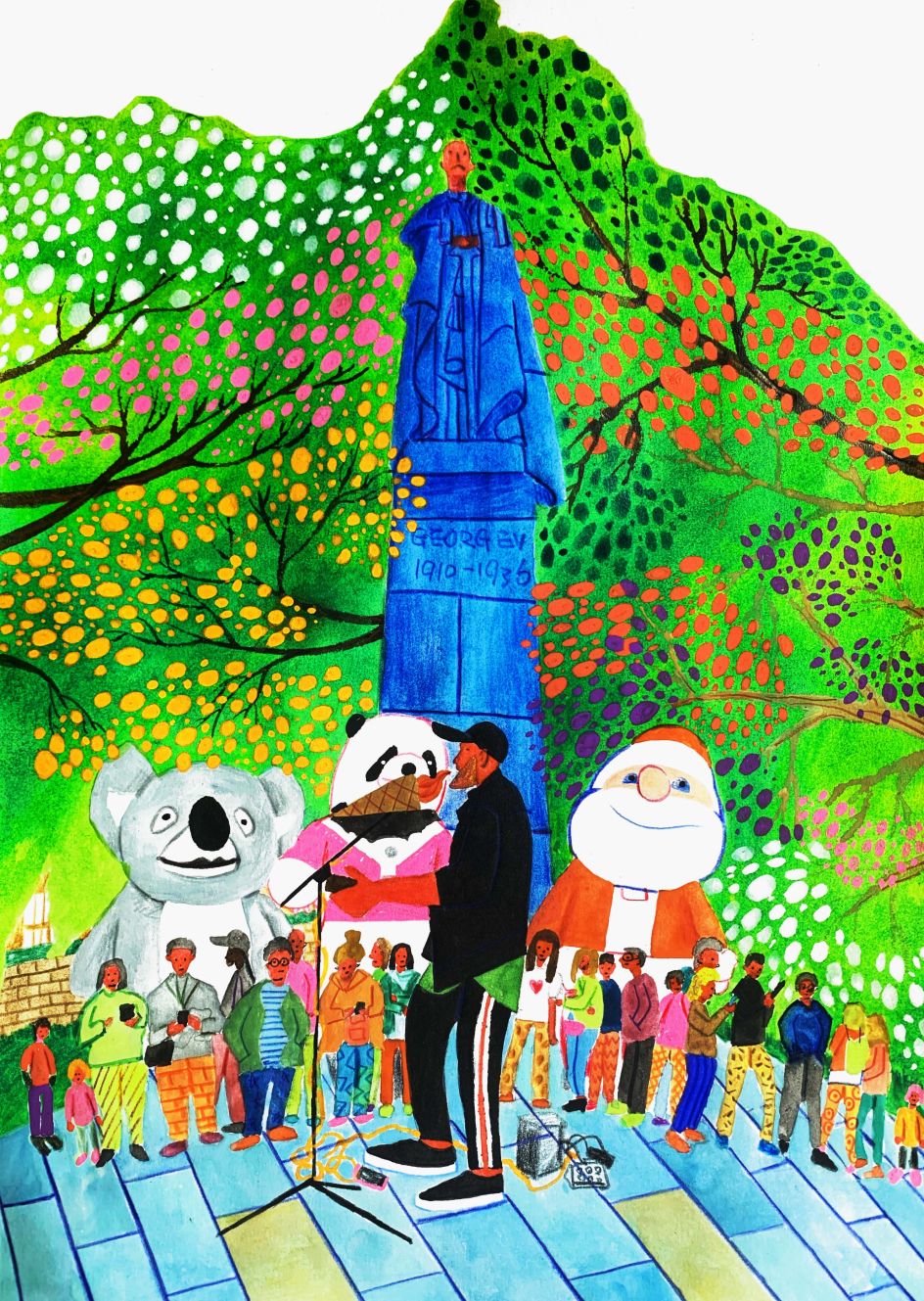 There's a clear love of people when you look through Zhigang's work as well as an appreciation for the often comical or quirky moments in life that we come across when wandering a town or city on foot. In one illustration we see a child shyly smiling on a bus. In another, people sitting on top of one of the Landseer's Lion Statues in Trafalgar Square. One features a woman barefoot, waiting to use the cash machine while another focuses on a beach scene with sandcastles, deckchairs and seagulls. It's a charming tribute to our small island.