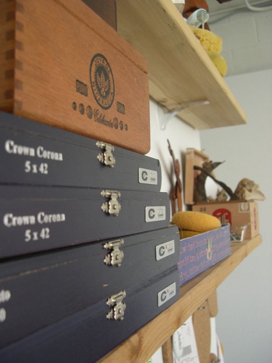 "I usually have four projects going at once and it's a pleasure to leave everything scattered about: organized chaos. I collect old cigar boxes and wooden crates for storage. My two desks are high wooden tables made of discarded doors and saw horses. I have rounds of cork trivets hanging on the walls, which I use as bulletin boards– an idea I borrowed from Design Sponge a few years ago. Of course, I was too lazy to paint mine pretty shades of colours.