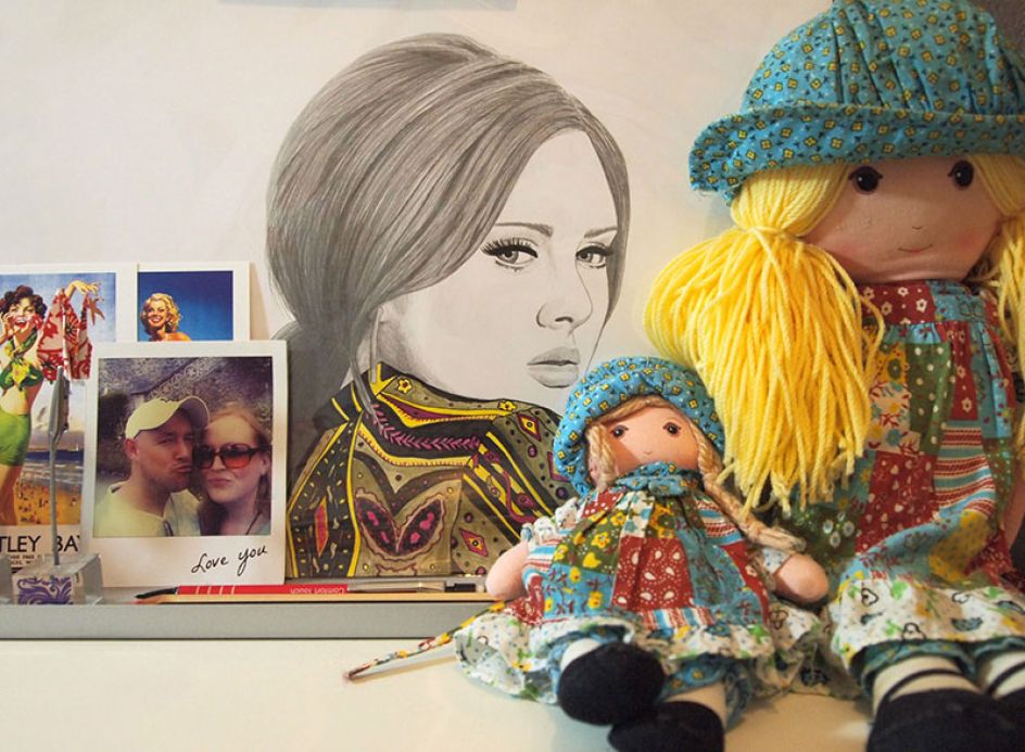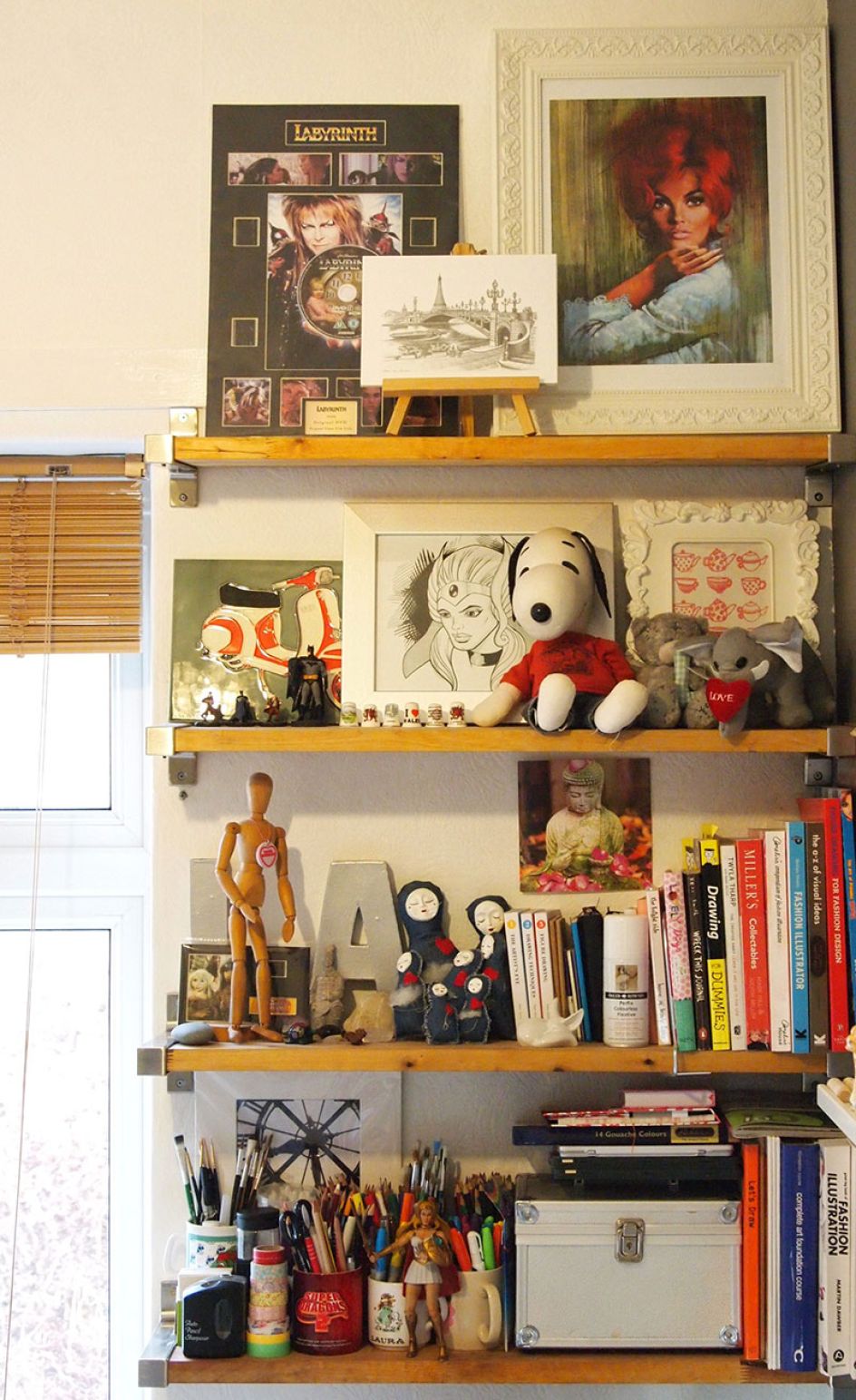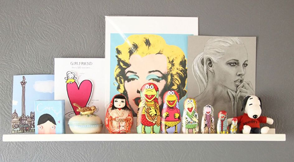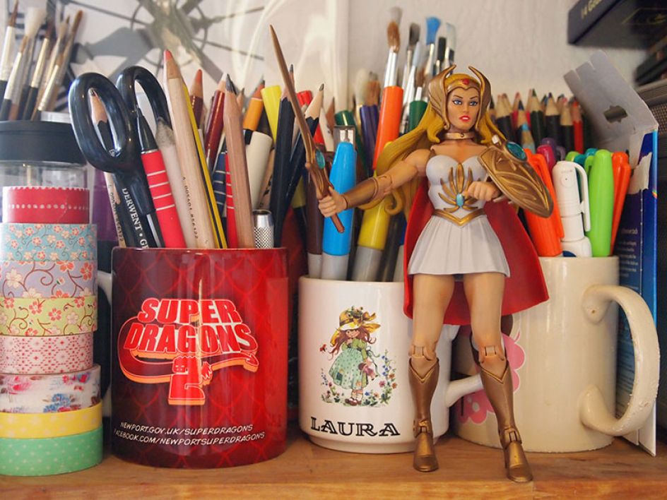 "I’ve filled my studio with items that inspire me, little trinkets and handmade treasures from friends and other Etsy sellers. I didn’t realise until I took these photos how many 80’s characters I have dotted about but there are quite a few! My favourite items are my chair with a thrifty £1.50 throw and cushion I made from vintage Sanderson fabric, a print of my favourite painting by Lou Shabner and my She-Ras - one was a gift from my boyfriend and the other was drawn for me by an artist at Marvel.