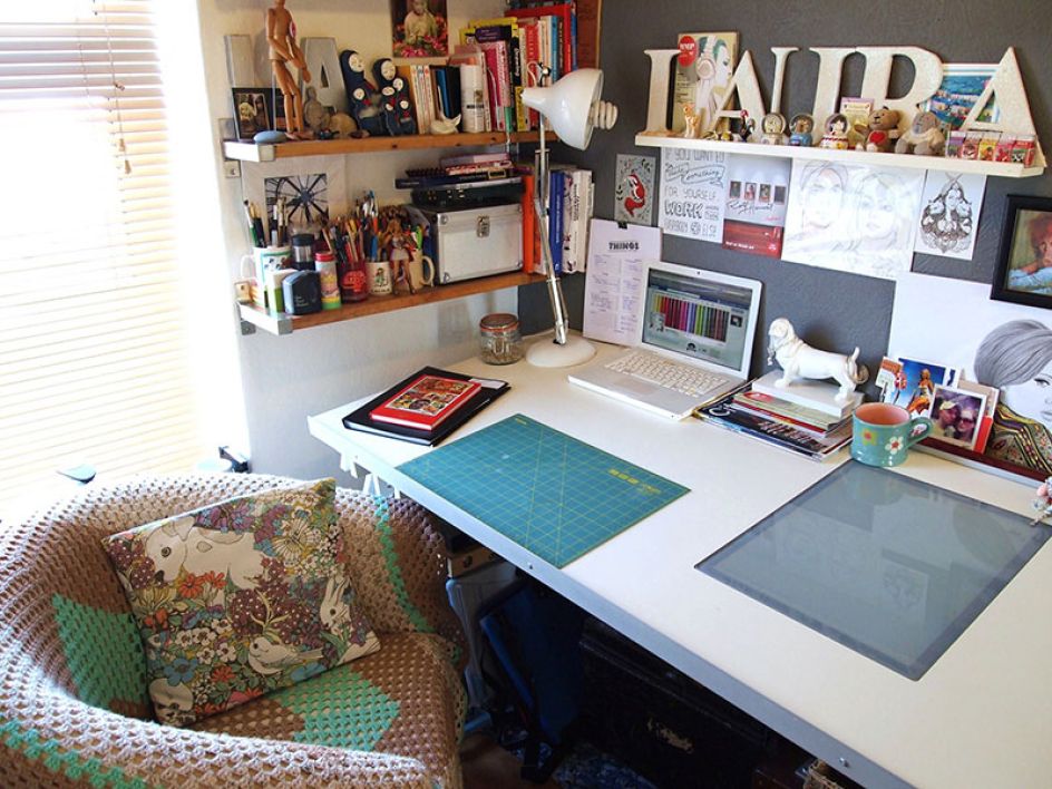 In Laura's own words: "I live in a small village in the Rhondda, if you’re a fan of 'Stella' you’ll be familiar with it as it’s filmed around here. I’m not too far from Cardiff and only five minutes from a Starbucks - but far enough into the Valleys that the only thing I see from my studio window are sheep and the occasional cow. Since going self-employed my workspace has taken up various locations around the house, including the kitchen, dining room and loft. Last year I decided to create a dedicated workspace - to fill with inspiration, keep my clutter together and give me somewhere to 'go to work' in the morning and shut away at the end of each day. We re-decorated the spare room and I bought myself a drawing table to work on, with an 'office' desk in the corner housing my PC, printer and stock I have everything to hand in one place."
