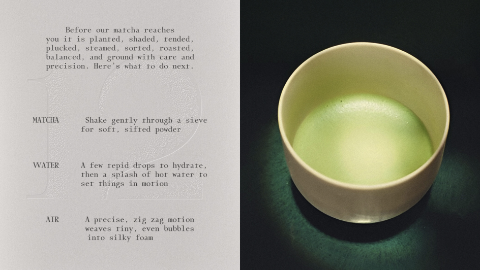Even the name 12 carries layered significance, from astrological and spiritual associations to the 12Hz brain frequency linked with calm, alert mental states. "'12' was chosen for its universal symbolism, making the identity broadly resonant while remaining rooted in the ancient craft and ethos of matcha production," Lew explains.