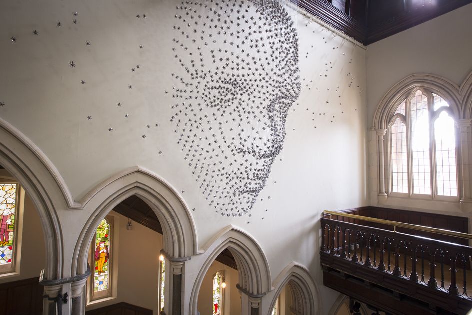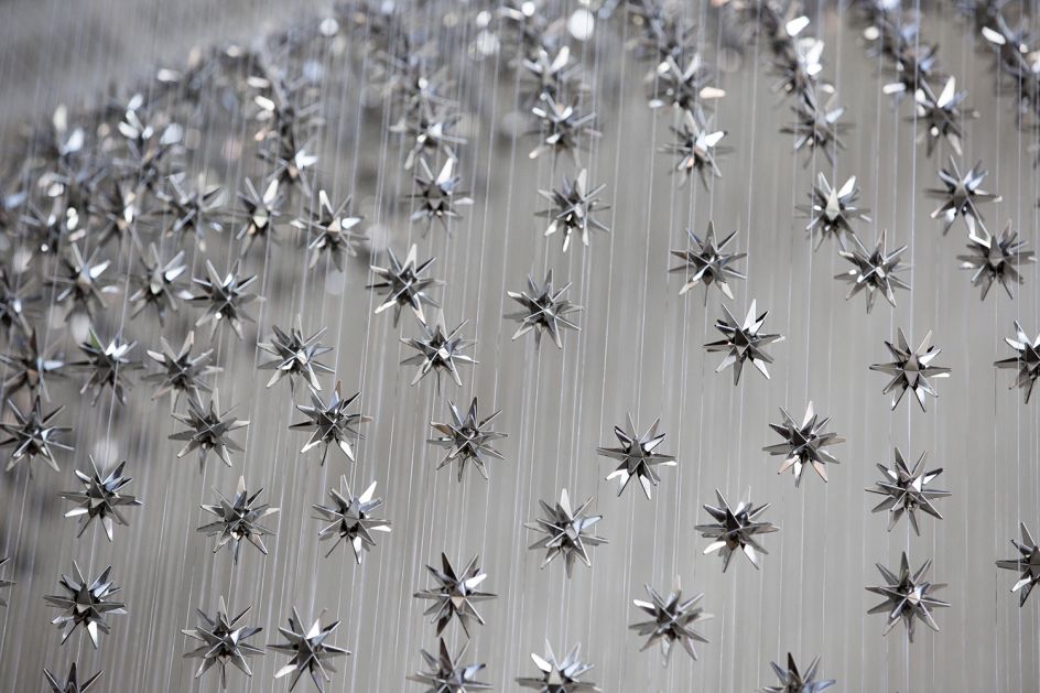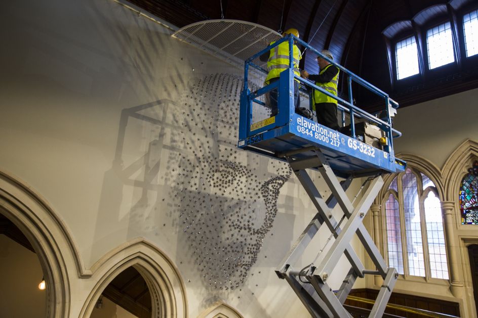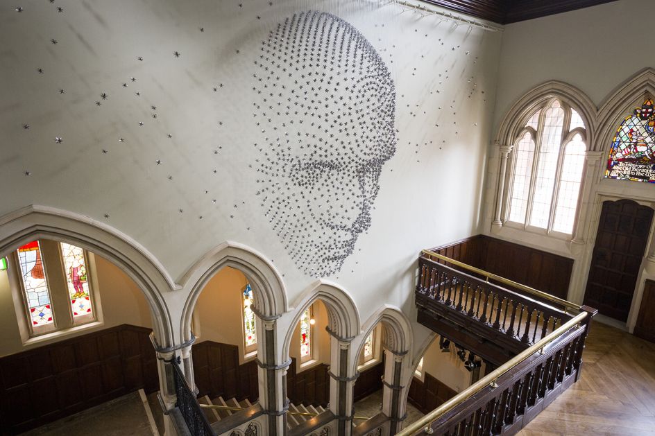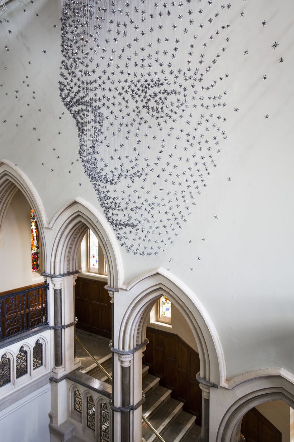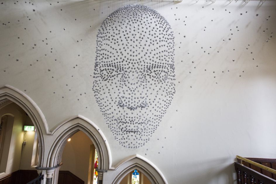 Made from 2,000 stainless steel stars suspended from the ceiling by fine wires to make the shape of a huge human face, the three-dimensional artwork has an ethereal quality to it, reflecting light and moving gently in the air. Surrounded by further metal stars, it loosely reflects the position of the constellations on Shakespeare’s birthday.
