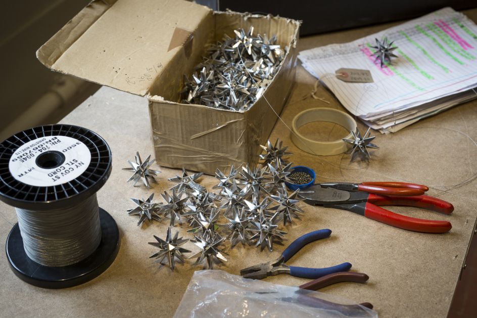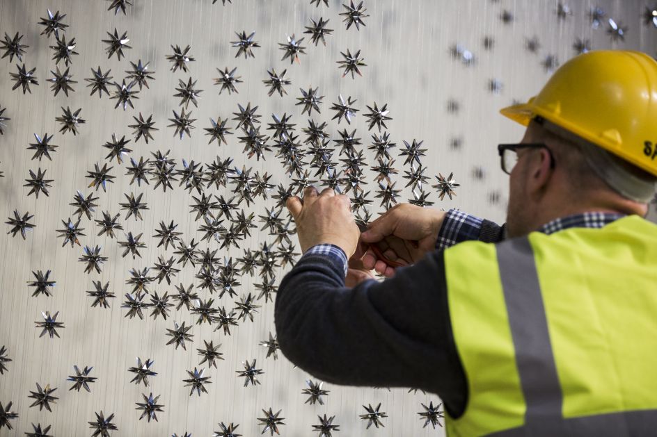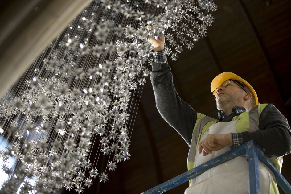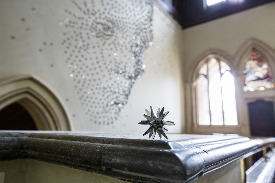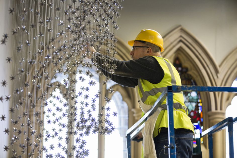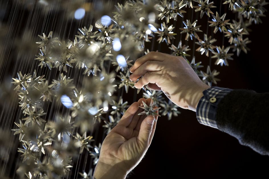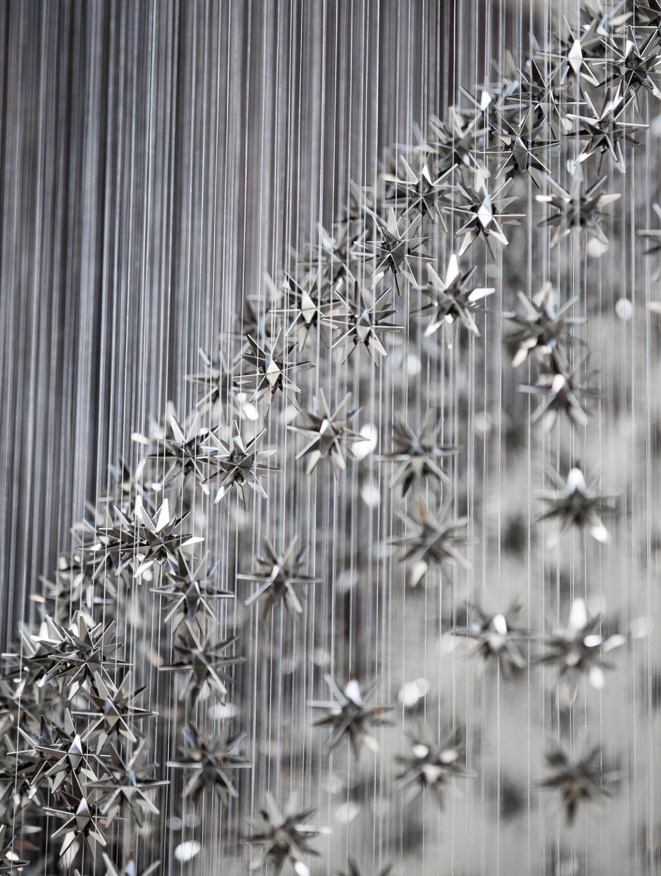 Made from 2,000 stainless steel stars suspended from the ceiling by fine wires to make the shape of a huge human face, the three-dimensional artwork has an ethereal quality to it, reflecting light and moving gently in the air. Surrounded by further metal stars, it loosely reflects the position of the constellations on Shakespeare’s birthday.