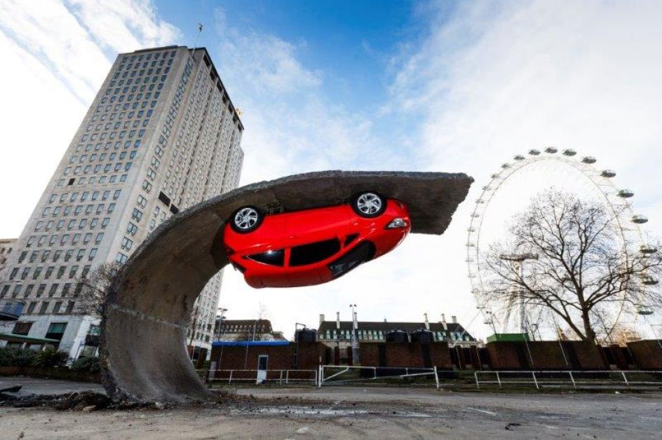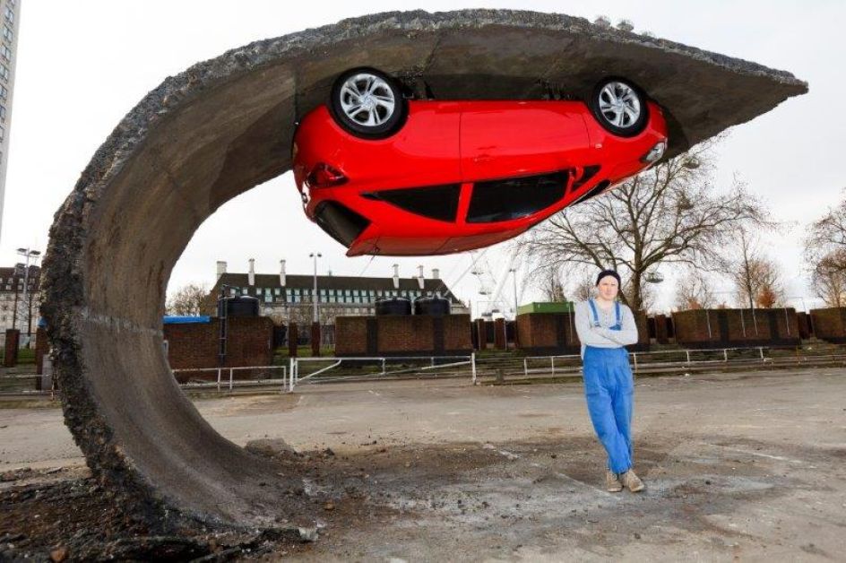 British artist Alex Chinneck, famous for making Covent Garden hover and for creating a melting house in Southwark, has revealed his latest illusory artwork where a Vauxhall Corsa hangs 15 feet in the air while still attached to the road at London’s Southbank Centre.