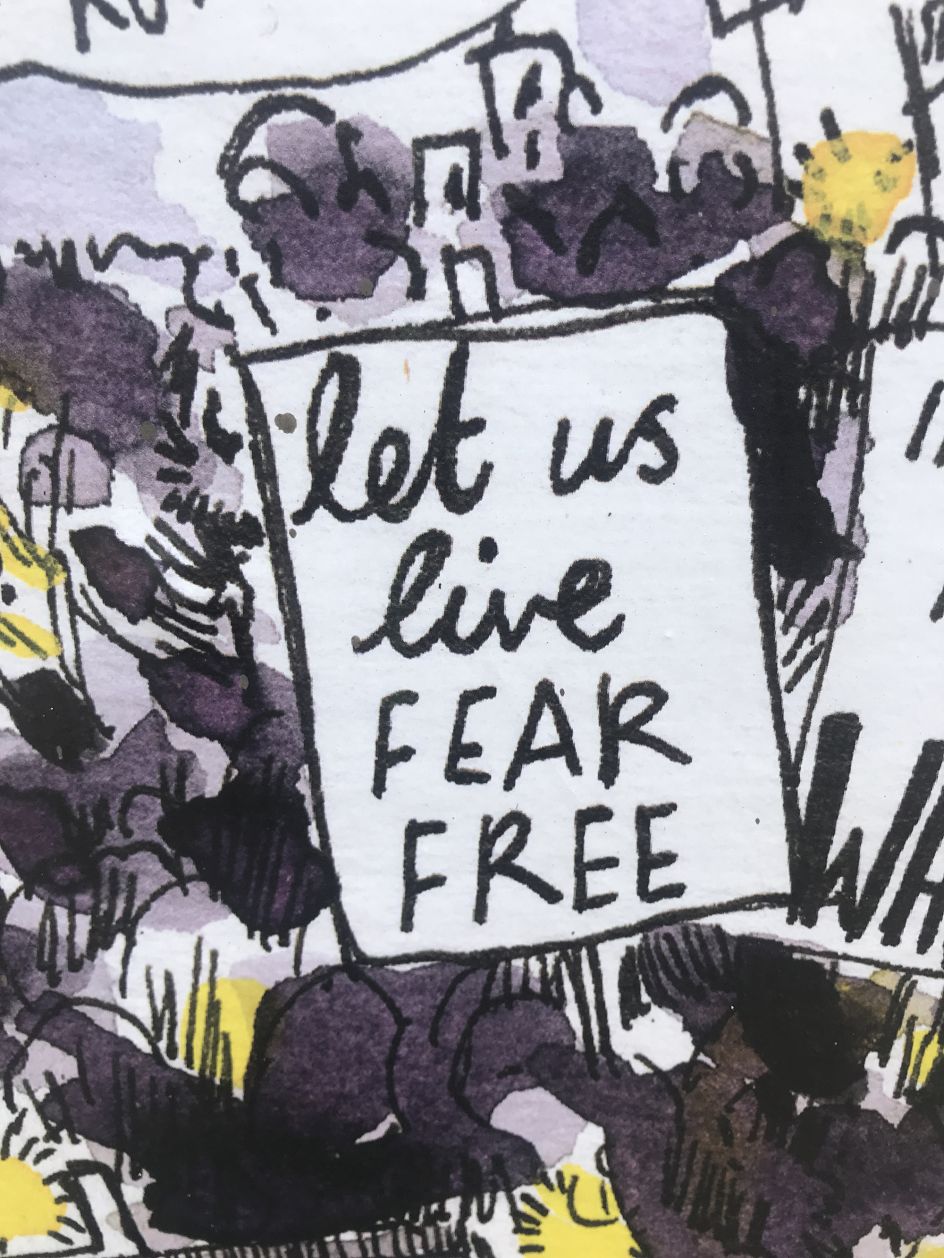 Look closely at the giant artworks and you'll see familiar recent scenes from Clapham Common, of protestors holding up banners and placards, the messages on which were crowd-sourced from social media. These include: 'On my way home, I want to be free, not courageous', 'Let us live fear free', 'I can't believe we still have to protest this sh*t' and 'Today I choose rage'.