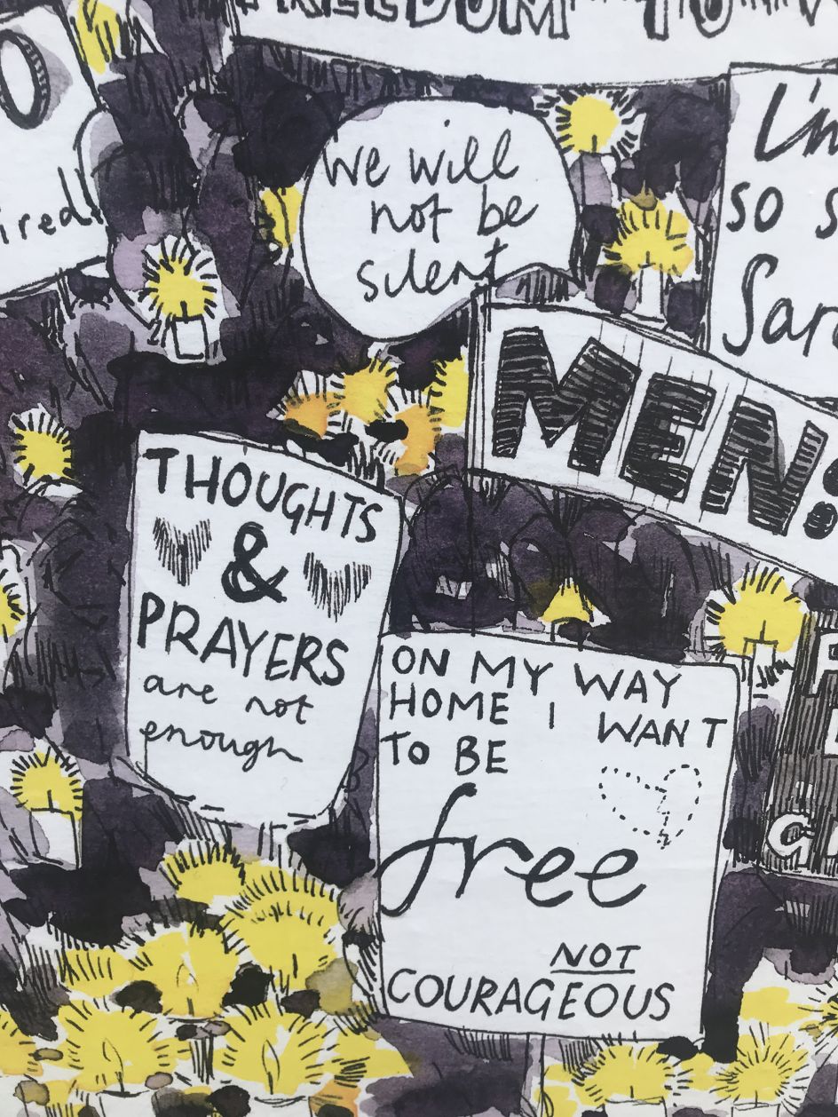 The outdoor campaign includes her artwork, All Under the Night Sky, featuring people holding placards at the Sarah Everard vigil. Crowdfunded by Groom, it kicked off in her home city of Bristol in March and has since been rolled out to Glasgow, Exeter, Cardiff, Birmingham and several sites in London including Oxford Circus, Kings Cross and Clapham Common – where Sarah Everard disappeared.