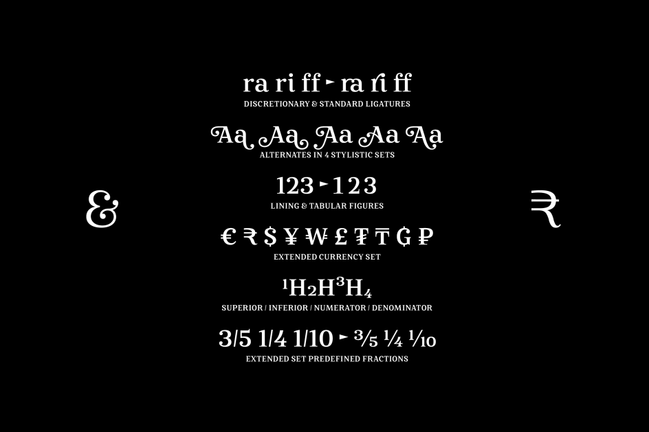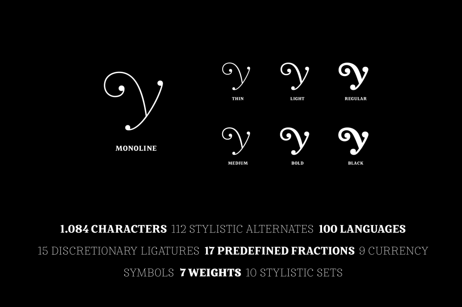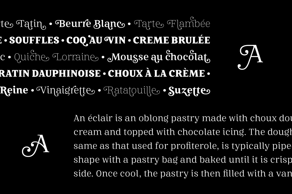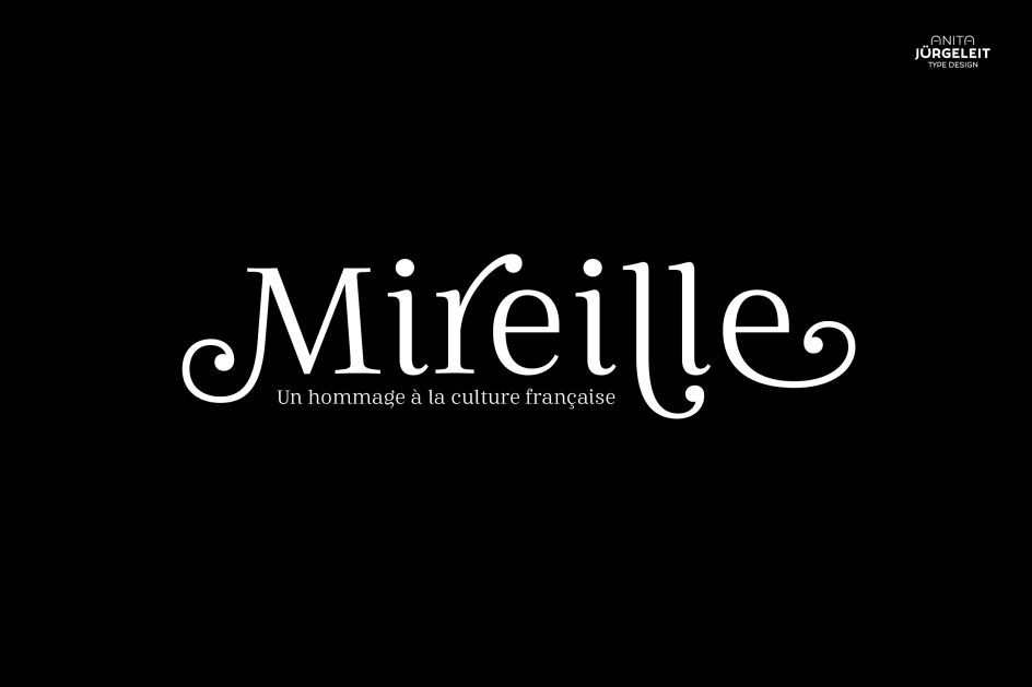 A serif typeface with seven styles, 1,000 glyphs, and over 100 alternates and ligatures, Mireille covers all European languages and includes advanced Open Type features. Anita describes it as "your journey through gourmet food, classical music, opera and wine tours, allowing you to add outstanding elegance to your typography".