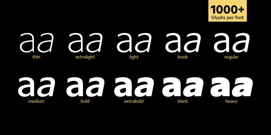 It's incredibly versatile, too. There are 20 styles overall – its thinner and thicker weights are suitable for strong headlines, while the middleweights can be used for "typographic challenges" and body text. Ardena comes complete with an extensive character collection, covering over 200 Latin-based languages. It also has an extended set of currency symbols and a range of Open Type features. Plus there are alternative characters as stylistic sets, small caps, and automatic fractions.