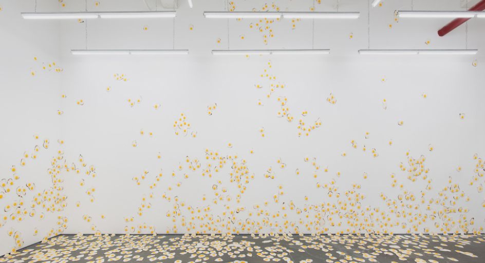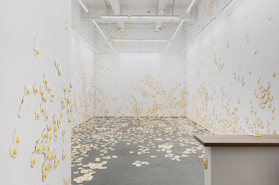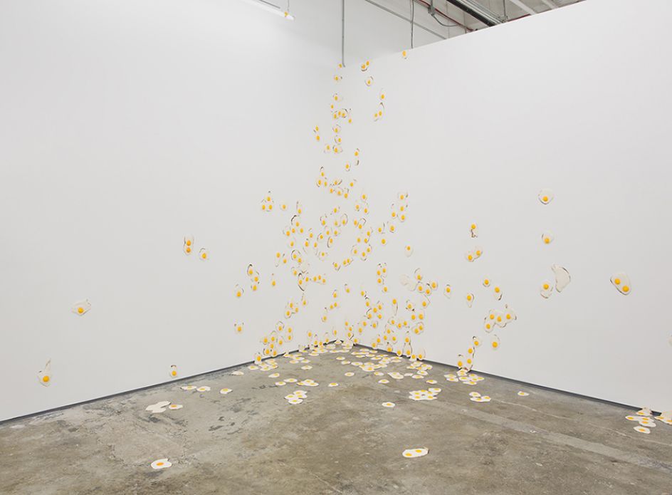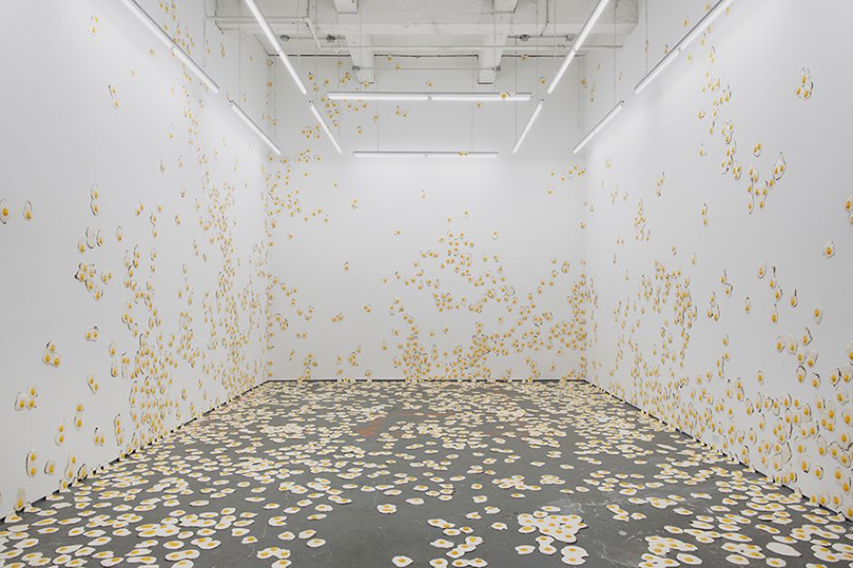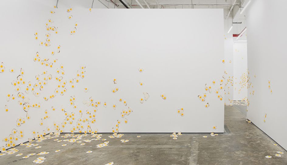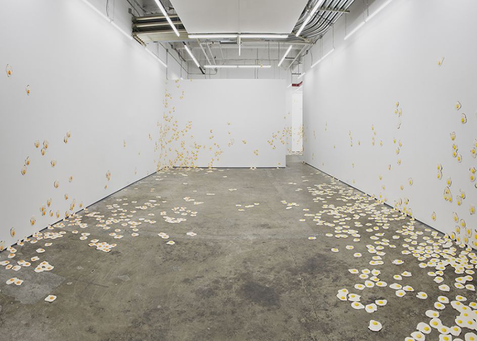 For his third solo show at New York City's Kate Werble Gallery, artist Christopher Chiappa presents a new body of work in its entirety, a series of 7,000 handmade fried egg sculptures exhibited as a growing infestation that invades its surroundings. This exhibition is the result of five years of filling his own studio with these fried eggs.