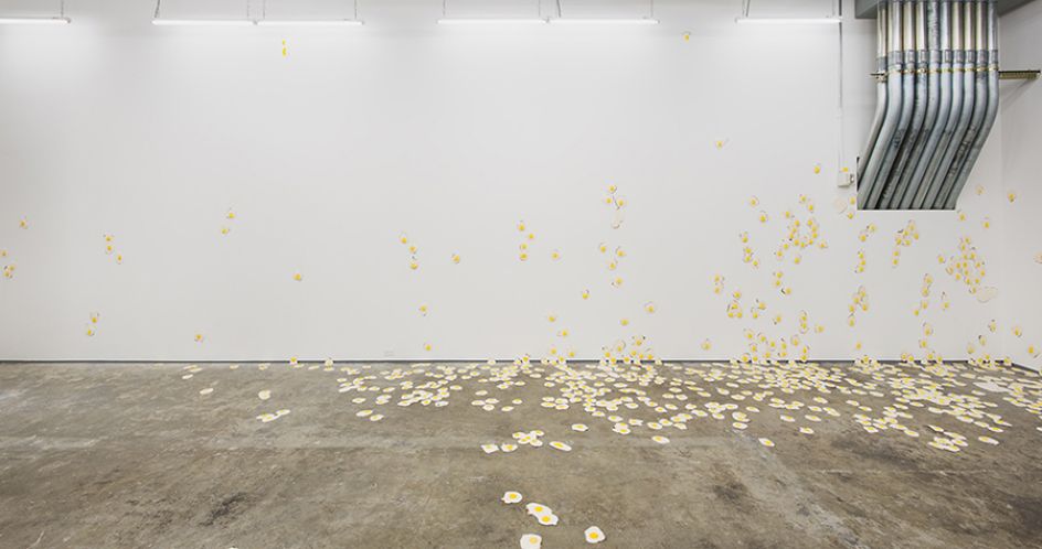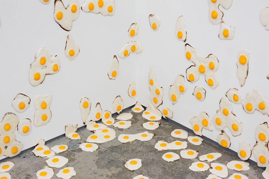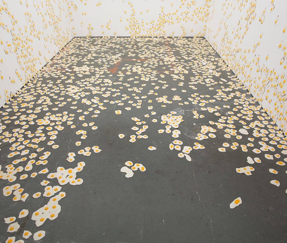 At the Gallery, the eggs are exhibited creeping down the walls and spreading across the floors. This demands your immediate attention and leaves you wondering is it a friendly crowd, a humorous displacement of the everyday? Or, is it an infestation – an angry mob, mould, or cancer, multiplying? As the show information reads: "The robust symbolic function of the egg adds further complication. Eggs are traditionally coded positively, embodying perfection, purity, resurrection, and unbounded potential. The fried egg, on the other hand, occupies a more dubious position. It is broken, defunct, dead, more suburban than divine, and suggestive of the materiality of sex rather than the purity of rebirth. It is, as the notorious PSA announcement tells us, 'your brain on drugs' – the domain of the slacker and a symbolic loss of potential, but also the pleasure that might be found therein. Chiappa’s fried eggs operate squarely within the uncomfortable intersection of these two symbolic legacies, mining the darkly humorous vein where perfection and failure meet."