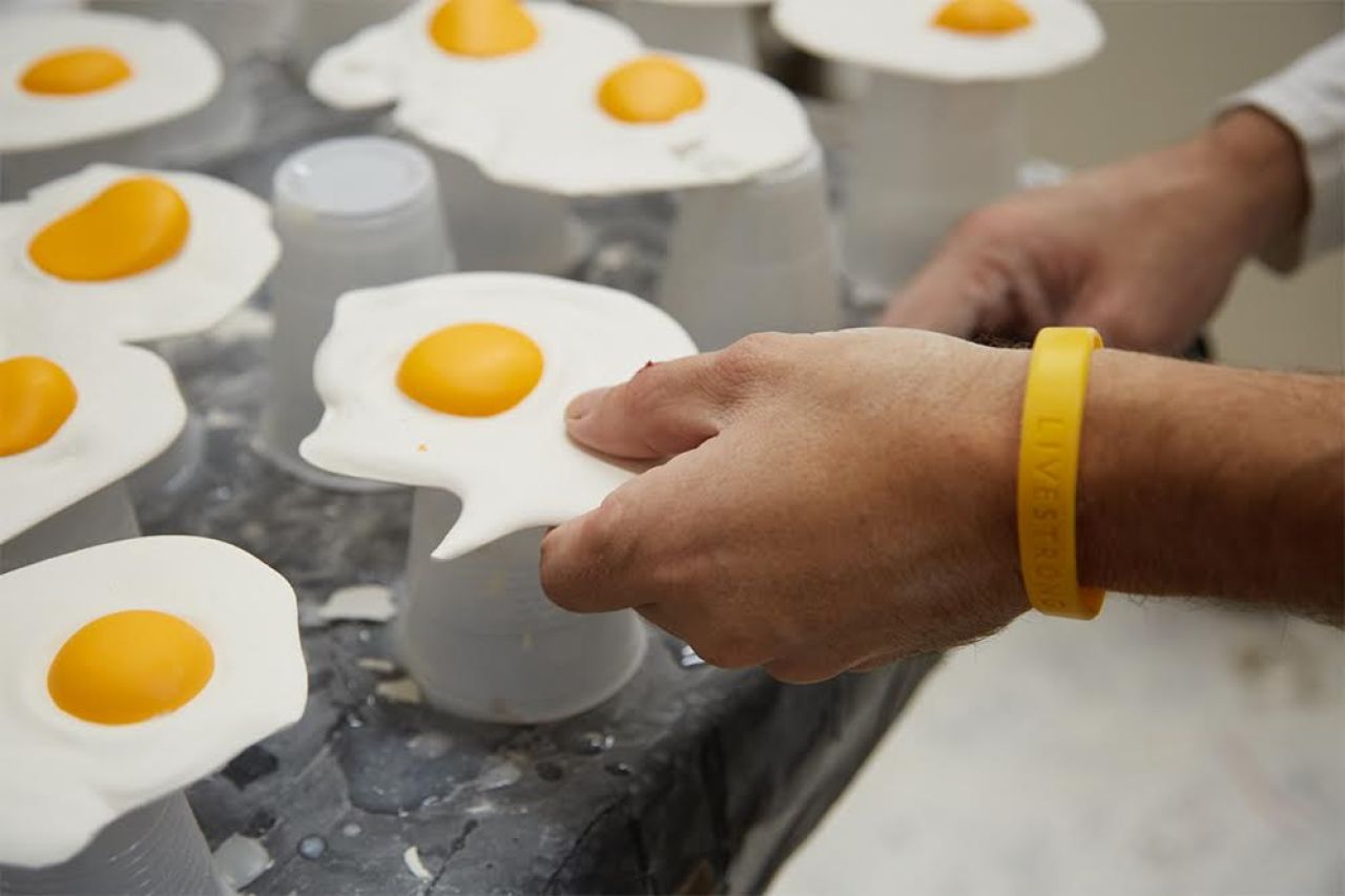 Apparently, they surfaced initially as drawings and then as actual fried eggs, draped casually over studio surfaces with candid photos snapped. The eggs multiplied and mutated, as he eventually adopted their form for hyperrealistic sculptures constructed through a carefully calibrated process of casting, pouring, sanding and painting plaster.