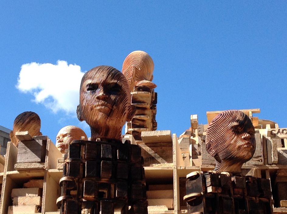 "Formed using thousands of sheets of plywood that slot together to create a skeletal mesh, the artist filled in, fleshed out and re-sculpted this one-of-a-kind artwork from hundreds of recycled broken pallets. The piece was then set on fire in a controlled manner, to produce the unique feel of a charcoal drawing.