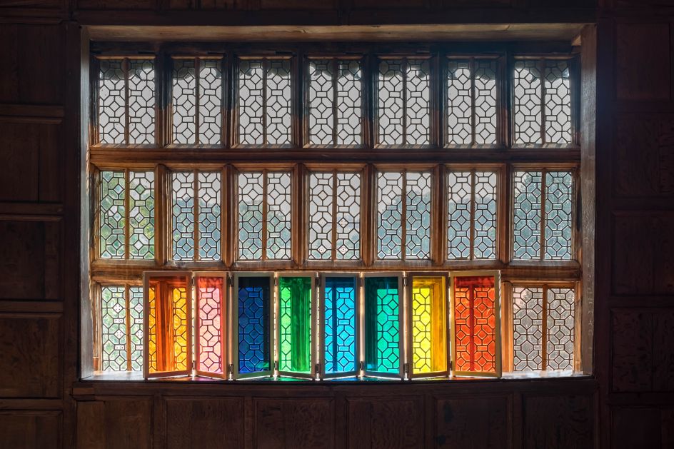 Light, as it streams through ancient glass windows, and the effect it can have on our sense of sight is the theme for the artwork, as Liz West explains: "Little Moreton Hall has over thirty thousand lead window panes containing Tudor and Victorian hand blown glass. This is subtly tinted by coloured impurities of copper, iron and magnesium.