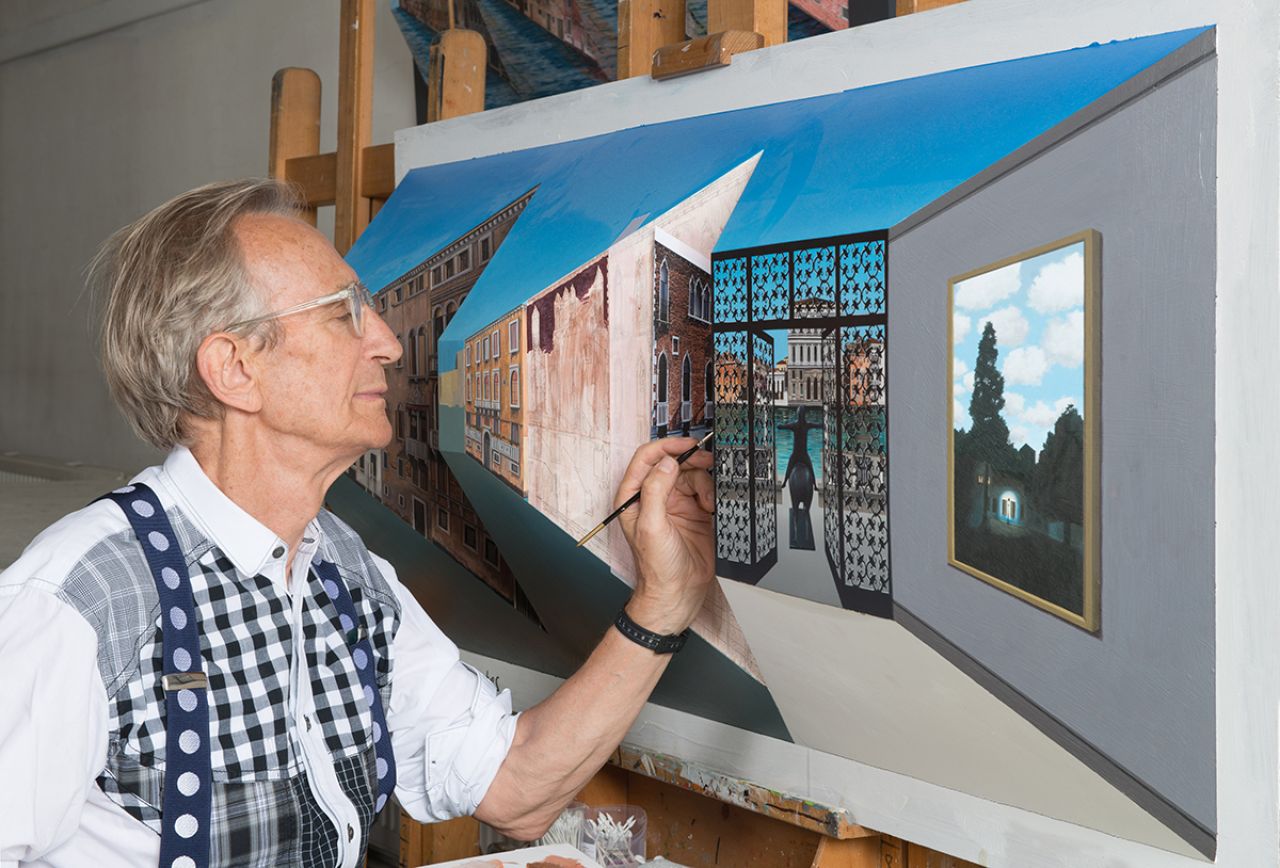 Since his breakthrough discovery of reverse perspective, Hughes has continued to confound viewers with his three-dimensional paintings, by presenting those parts of the picture that seem farthest away at the nearest point.
