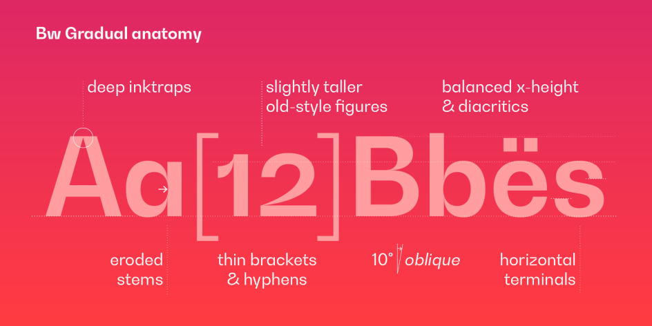 Designed for the utmost flexibility, Bw Gradual also delivers a very comfortable and pleasant reading experience when used as body copy, thanks to the deep joins acting as ink traps. Its clean legibility in smaller point presents a distinctive option for engaging editorials, web content, and mobile applications.