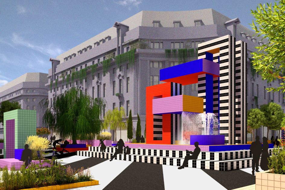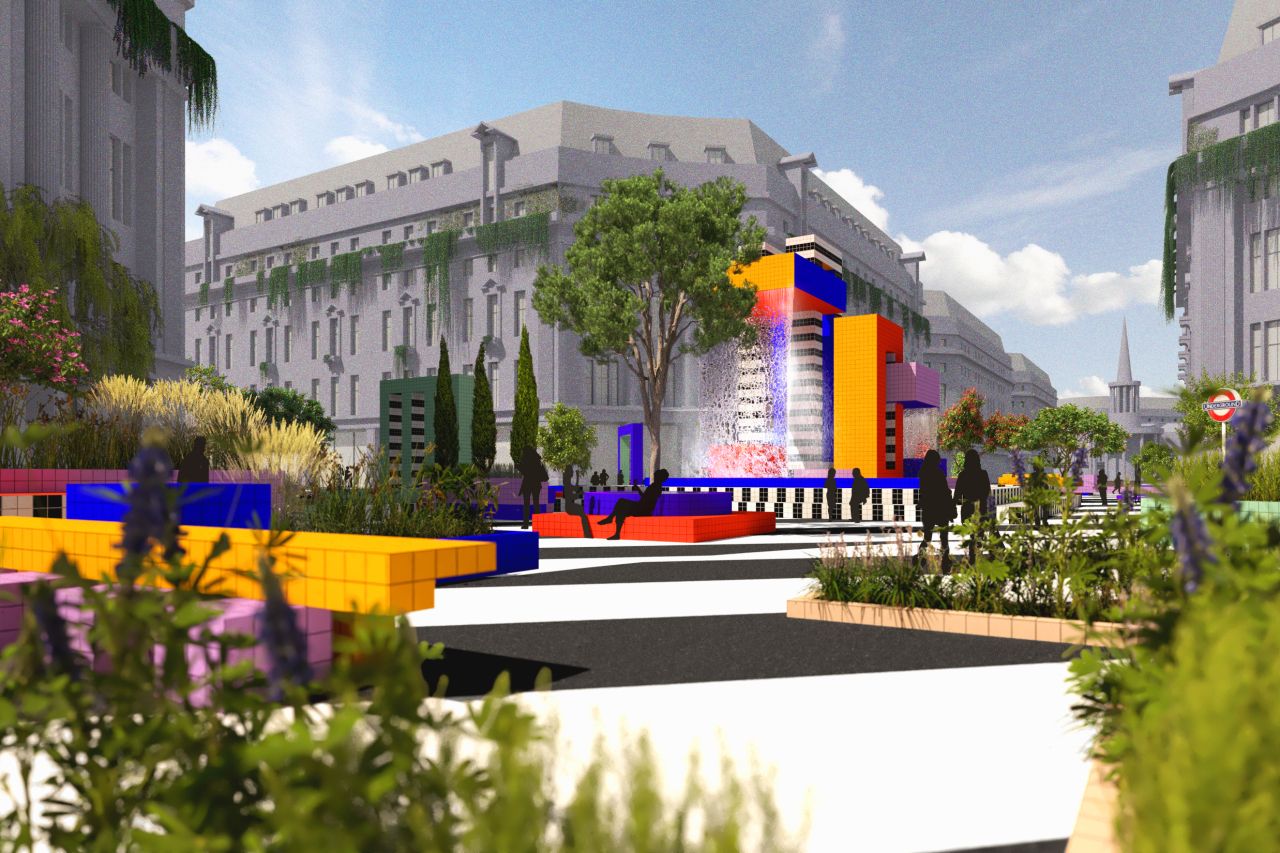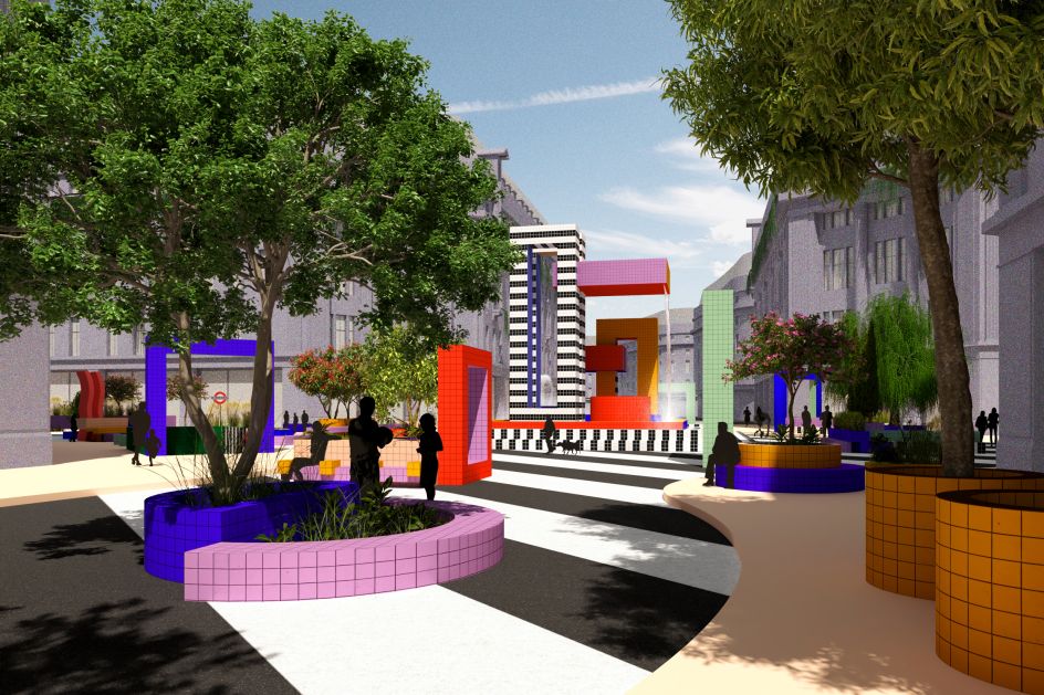 The experience inspired her most recent project: a speculative proposal for a pedestrianised Oxford Circus, where oversized fountains, flower-covered benches and planted pots – all in her signature colourful, geometric style – replacing traffic in the city's busiest high street. "What if there were spaces and structures that people could interact with however they liked?" she asked in a letter accompanying the renderings. "What if Oxford Street made you happy?"