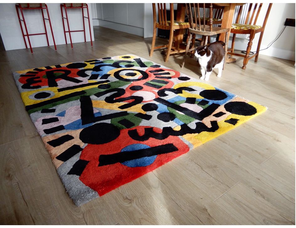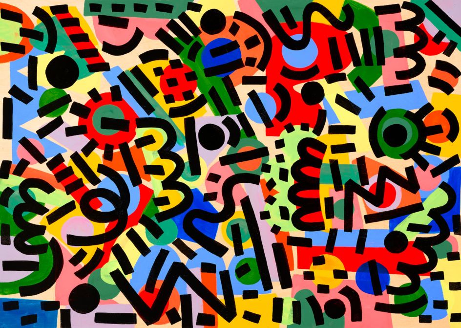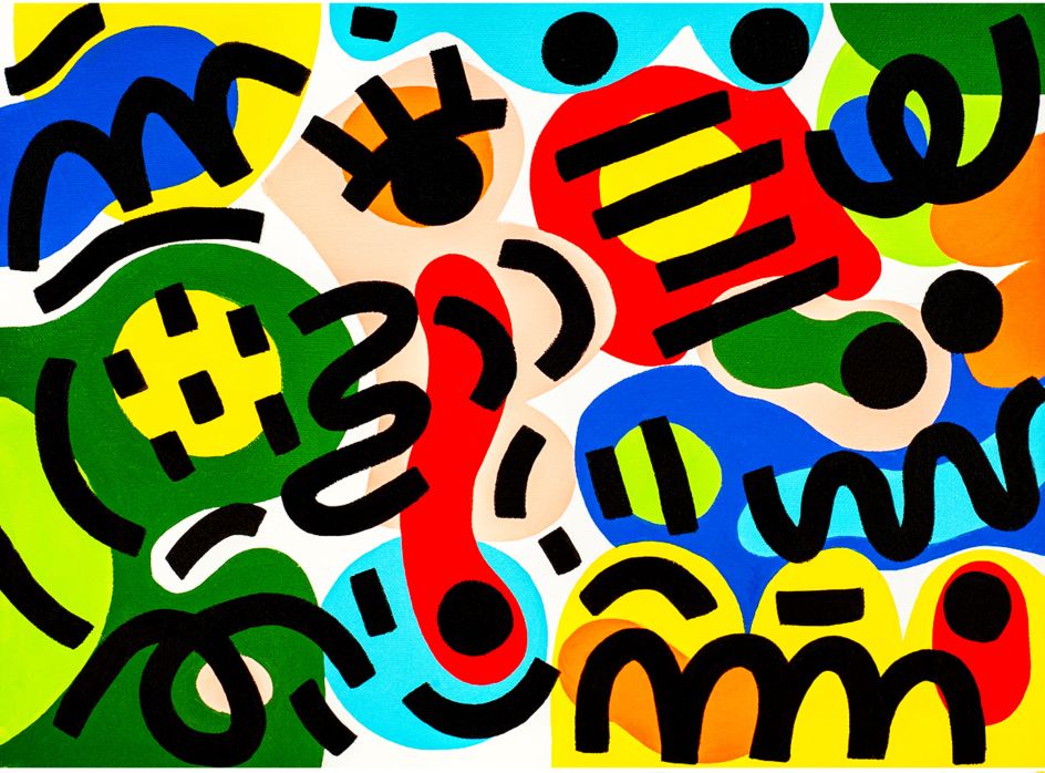 Caroline is known for her abstract, colourful paintings full of shapes and movement surrounded by blank lines and little messages – some of which she'll be putting up for auction as well. Her own background lies in graphic design, something she studied at the Manchester School of Art but didn't graduate, as she decided to take a break but never went back.