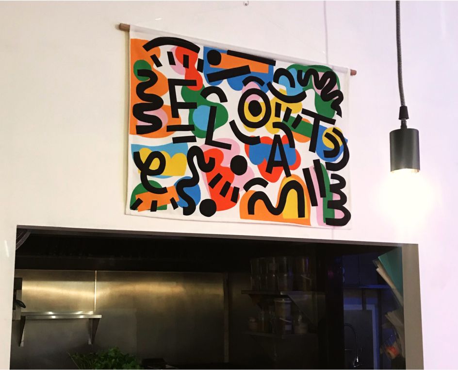 She uses acrylic and ink for her paintings, which are on canvas, wooden panels or paper. She also creates murals and does some digital work, too. "The digital work has been used to create rugs, tote bags and prints. I love seeing my work applied to a whole host of different objects. I have plans for more textile work this year."