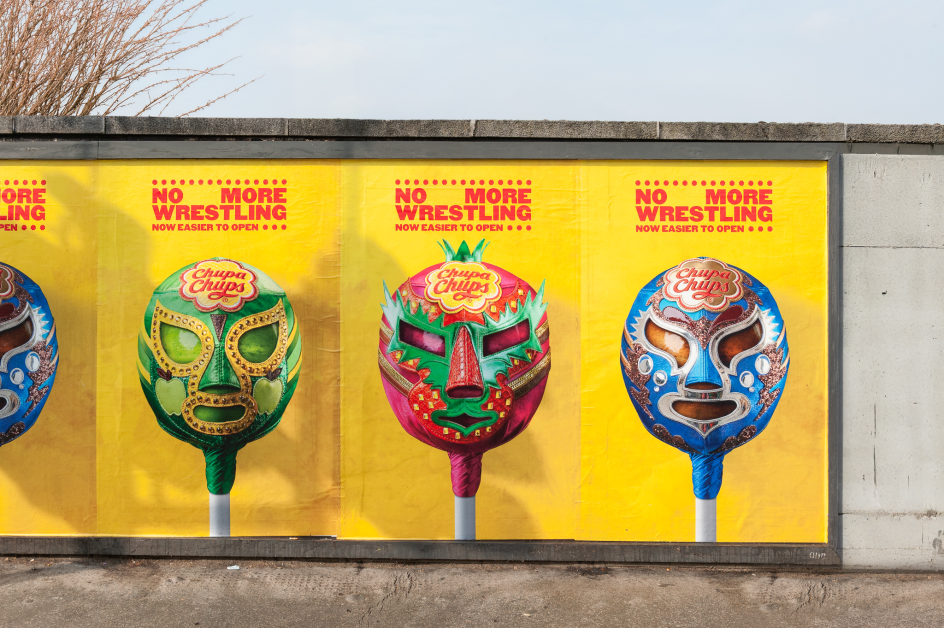 To announce the brand's new easy-to-open packaging, BBH London has launched 'No More Wrestling', an OOH campaign that leans hard into the absurdity of the hard effort required to unwrap a lollipop. There are three oversized posters and a trio of Lucha Libre masks. Each one is made from the actual wrapper of a Chupa Chups flavour: Apple, Strawberry, and Cola.