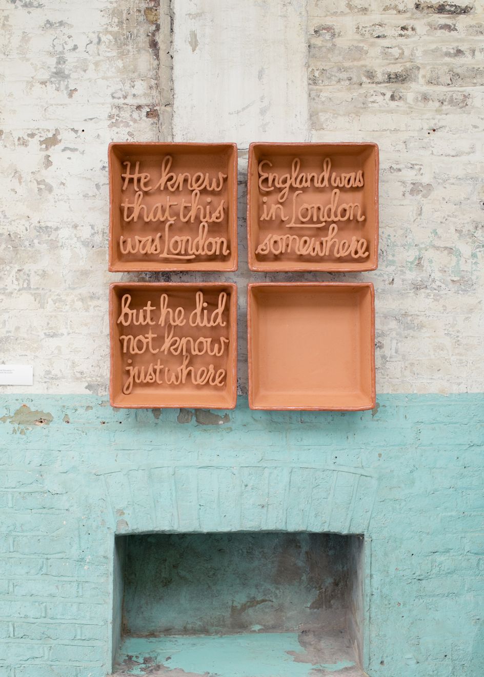 The eight works vary in scale and form. 'Individual Motives' is composed of large, hand-rolled tiles featuring details of etchings found in Dr Barnado’s Night & Day journal, published at the time he founded the Ragged School. Another piece, 'Panel Discussion', comprises four three-dimensional tiles inspired by a 15th-century Italian shrine and featuring a quote from Victorian journalist Henry Mayhew in hand-formed clay lettering. 'Fearful Symmetry' directly addresses the issue of who creates urban grids, while 'Top Table' explores the connections between empire and exploitation.