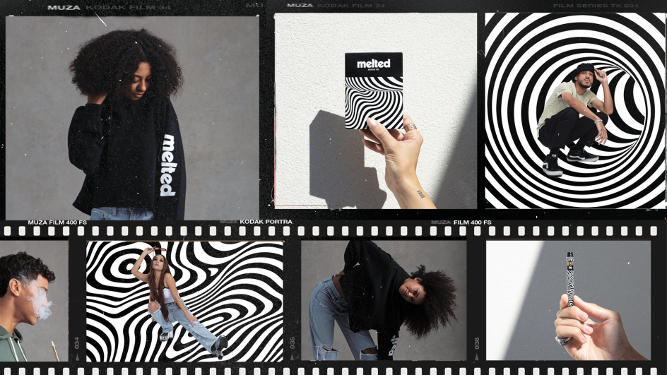 The first new brand released under the Studio umbrella is Melted, something described for the "regular user". Melted's voice is bold, monochromatic, and expressive, with a singular use of black and white for all branded materials and a range of surreal visuals, including warped, striped and checkered patterns.