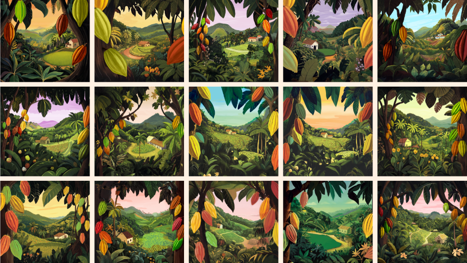 Illustration is central to the work. Wildish & Co. explored a range of visual directions, experimenting with landscapes, cocoa pods, people and farm scenes in styles ranging from detailed realism to more graphic, print-inspired approaches. The final hand-drawn style strikes a careful balance. It feels warm and human, but elevated enough to signal quality.