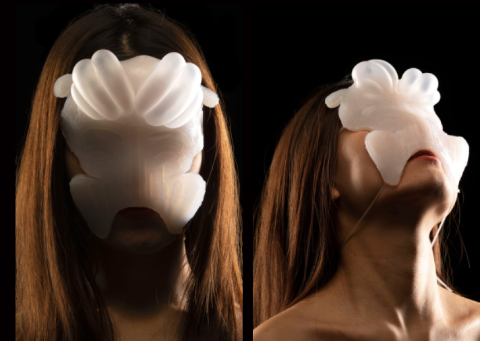 "Liǎn responds to your real-time online emotions using code and soft robotics," says Jann. "Sentiment analysis, a form of machine learning or artificial intelligence, is performed on your online interactions. If you post, like or comment with something positive, it'll return a positive score, inflating the part of the mask that represents a positive front. Conversely, if it's negative, it'll inflate the corresponding area.