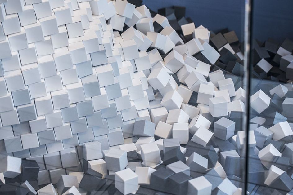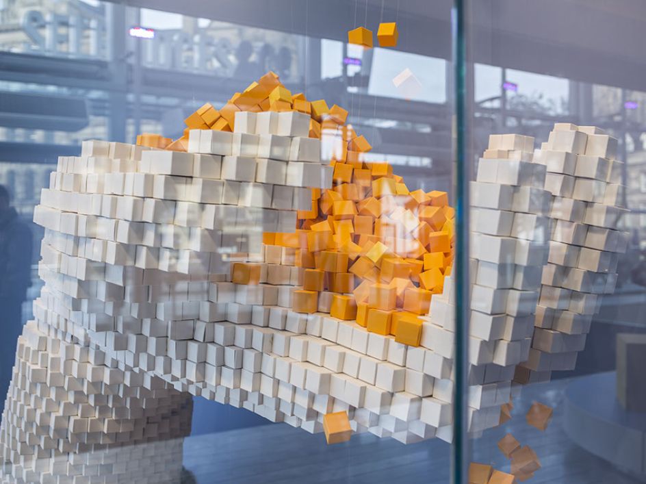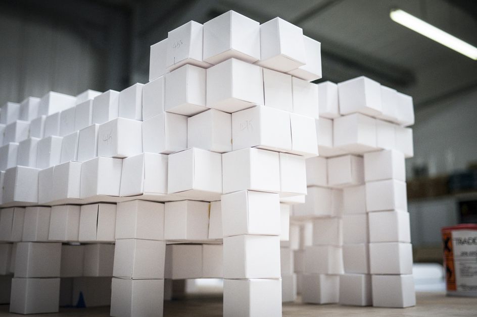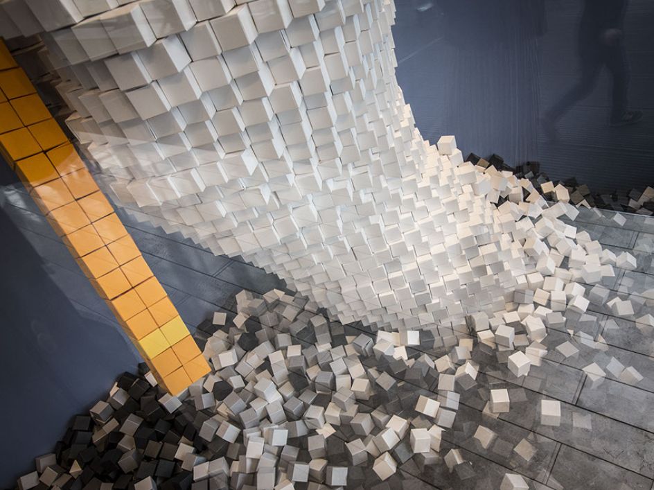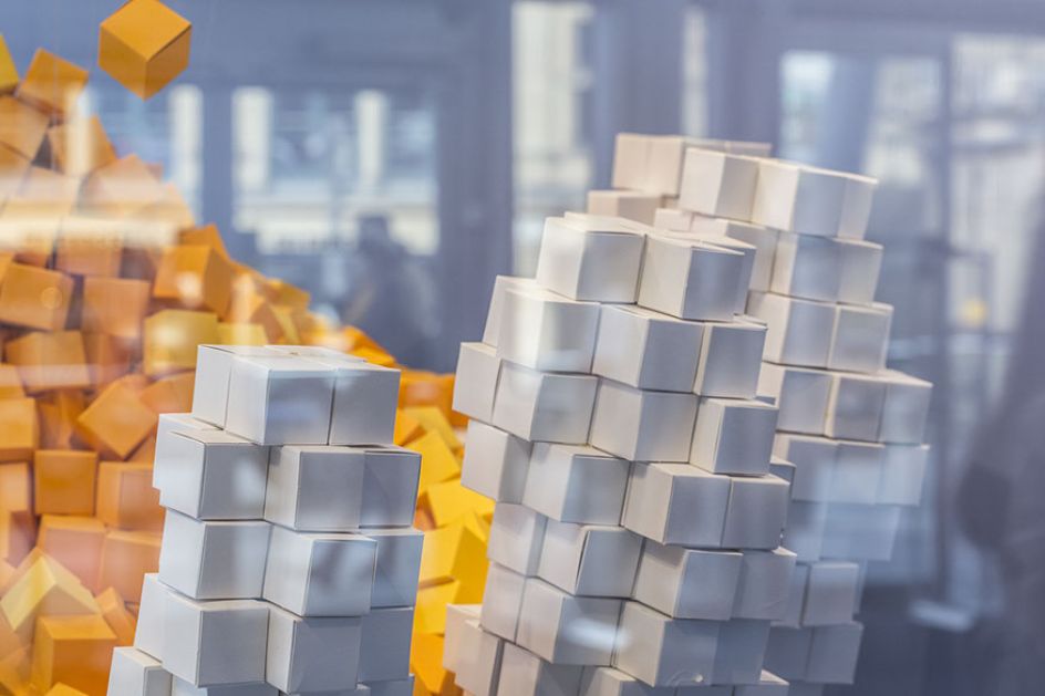 "Using a combination of traditional modelling techniques and 3D scanning technology, we crafted two larger than life hands entirely from 4cm paper cubes. The hands, standing at around 2m tall, emerge from layers of grey and black cubes in their thousands. In total, around 35,000 cubes were used, with each element of the space telling a story about sustainability, the creative process and the art of paper-making.