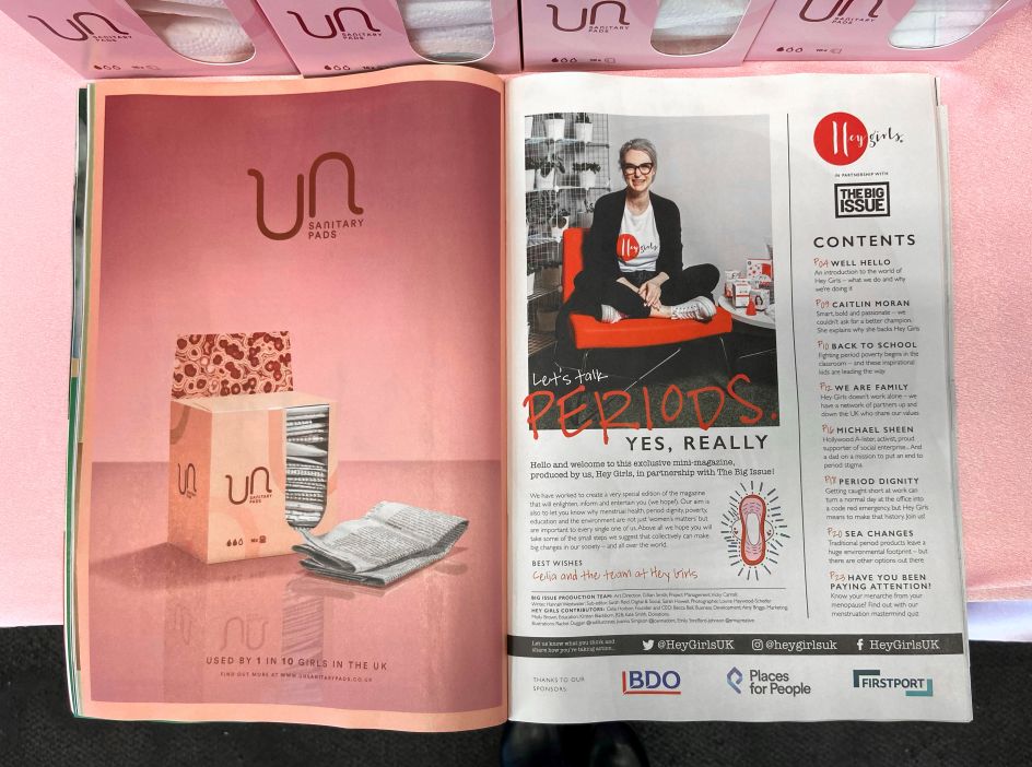 The UNsanitary brand, Hey Girls' biggest campaign to date, is being supported by a consumer campaign in partnership with 3 Monkeys Zeno and Clear Channel. To help drive further awareness and education, The Big Issue has created a ground-breaking special edition, which includes a 24- page special mini-magazine about periods, menstrual products, poverty, activism, the environment – and what we can all do to make a big difference by taking little steps.