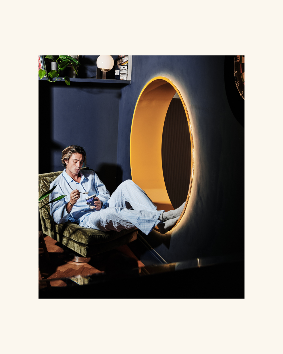 Photographer Charlie McKay's shoot is worth examining on its own terms. Rather than the oversaturated, golden-hour product photography that dominates food branding, the approach was overexposed and flash-on: the visual grammar of a late night, shot the way you might photograph something at a house party. It's an unusual reference point for ice cream, but to my mind, exactly the right one.