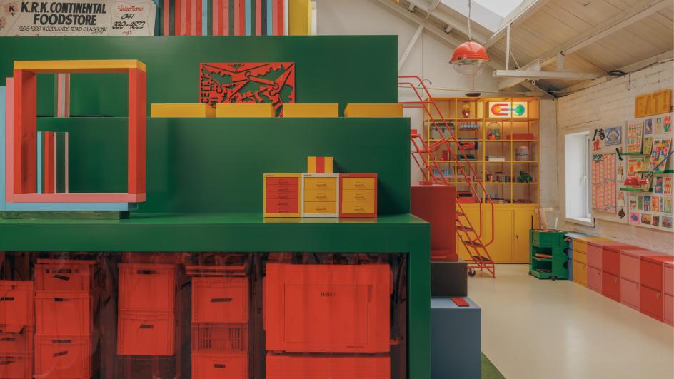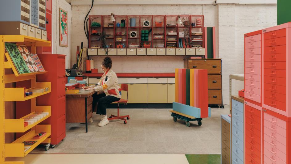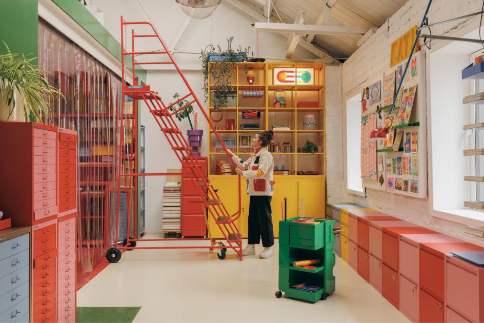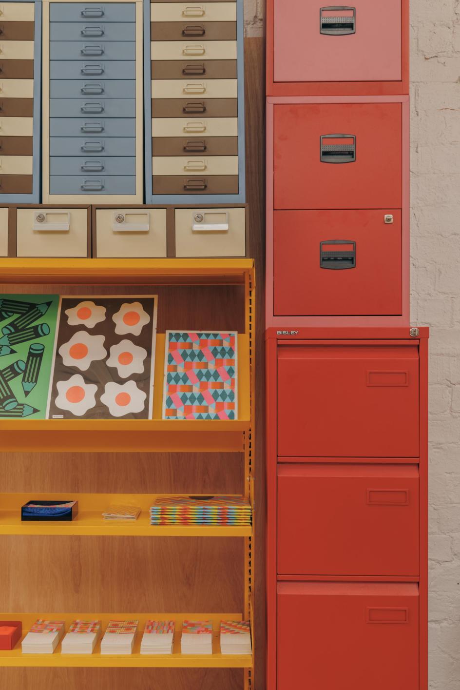 Alternating coloured drawers, contrasting product combinations and layered tones turn what would ordinarily be a storage specification into something closer to a site-specific installation. The classic Bisley Coffee and Cream finish appears on card filers throughout the space, a deliberate historical reference that sits in productive tension with the brighter, bolder pieces around it.