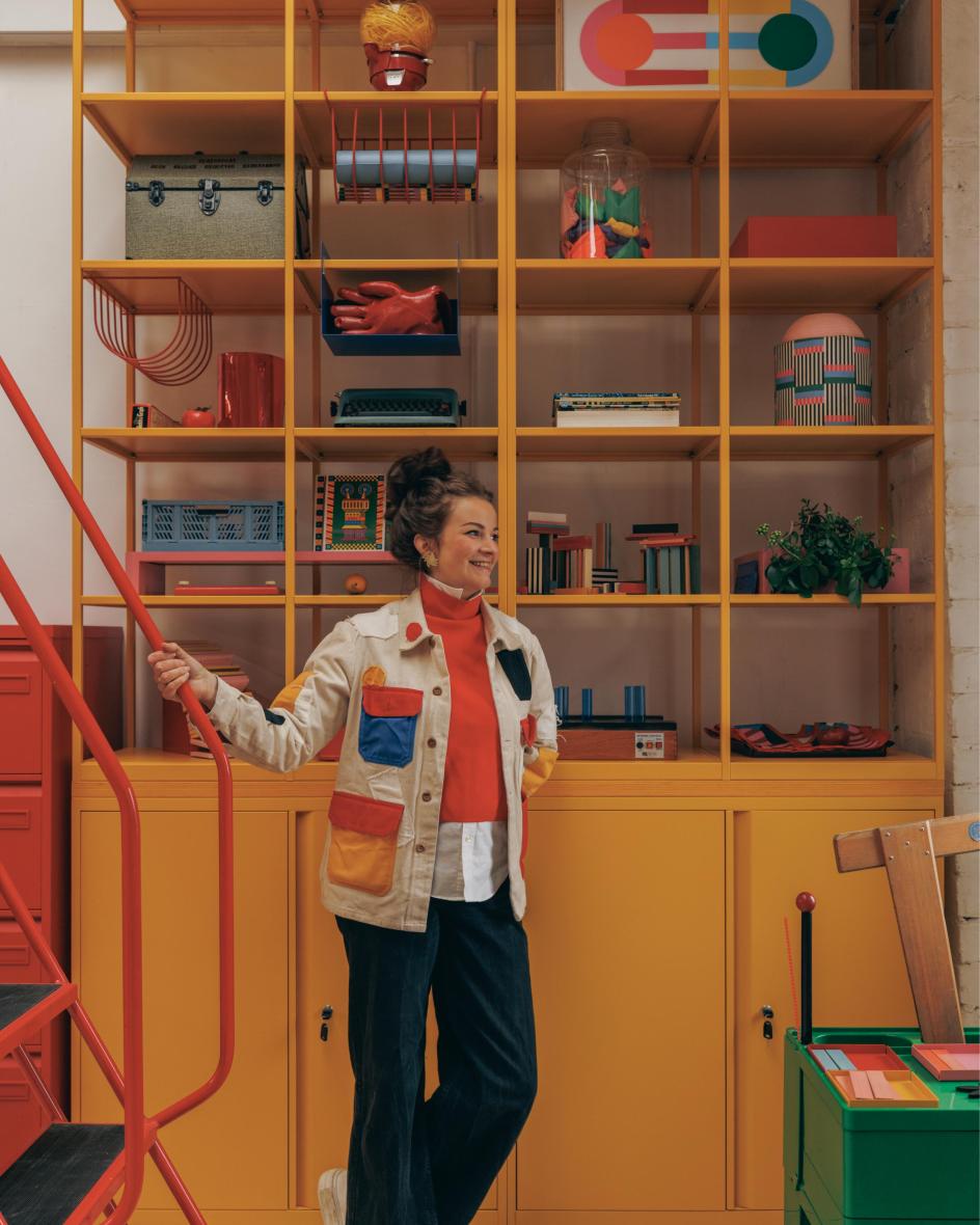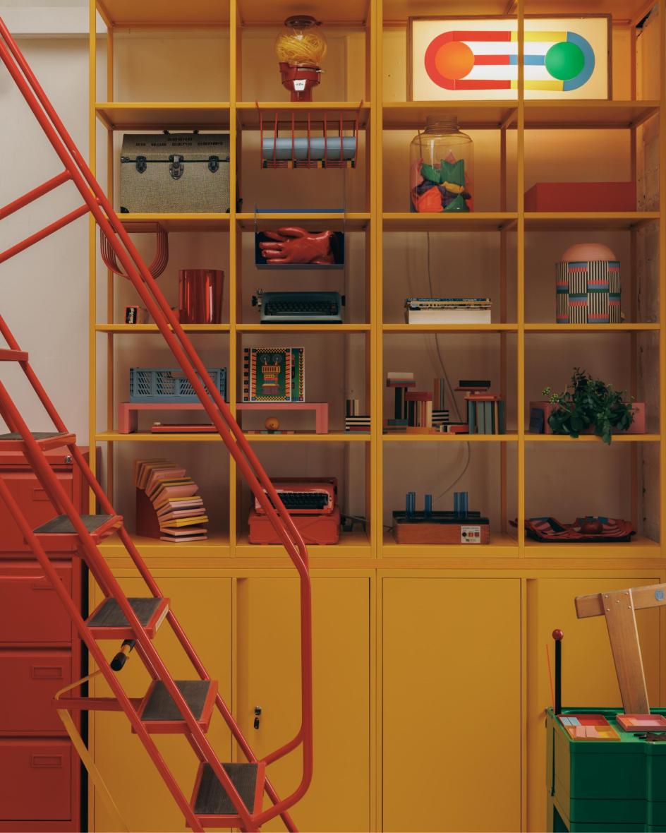 The first thing to understand about this collab is that the colour choices were not decorative; they were compositional. Marcella specified a mix of Bisley Blue, Bisley Pink, Cardinal Red, and Golden Sunflower Yellow across MultiDrawer units, LateralFile cabinets, Outline shelving, and classic filing cabinets, deliberately avoiding uniformity and treating each piece as part of a larger visual composition.