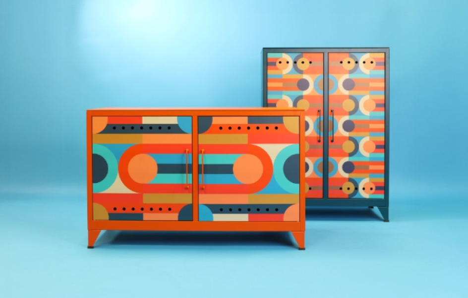 The collaboration, by the way, has a longer history than this single installation. The first phase, unveiled at Clerkenwell Design Week in 2025, saw Bisley classics, including Fern units and the MultiDrawer collection, reimagined with Risotto's printed steel finishes, featuring Marcella's geometric Tetris pattern applied directly to the surface of the furniture. That project brought the graphic language of Risotto onto the product. This one brings it into the space, which is a different and in some ways more demanding challenge.