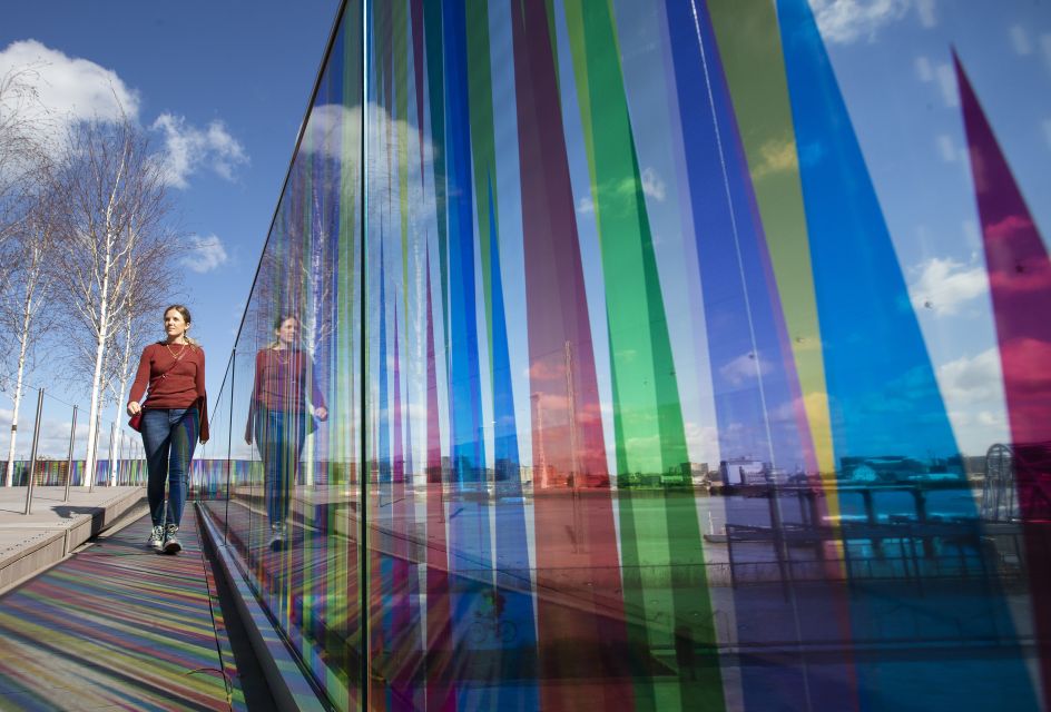 "The experience of seeing my work as you move along and around The Tide gives you a multicoloured and rich visual experience that will hopefully trigger feelings of well-being and joy," says Liz of her work. "It unveils unexpected delights for the senses, much like encountering the overwhelming cacophony of colour and shapes when walking into a sweet shop; the multicoloured pattern never repeats itself; juicy reflections on nearby surfaces; a spectral sundial on a sunny day."
