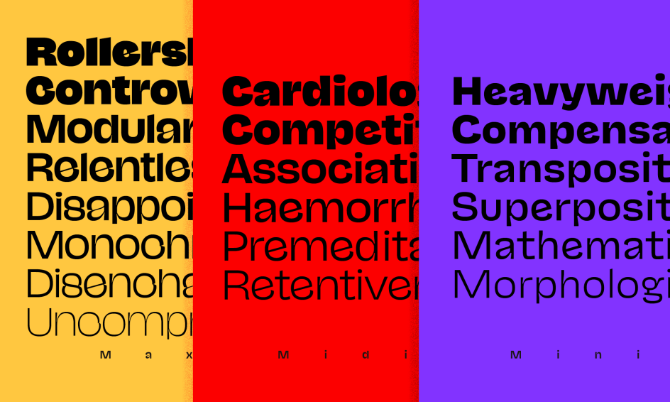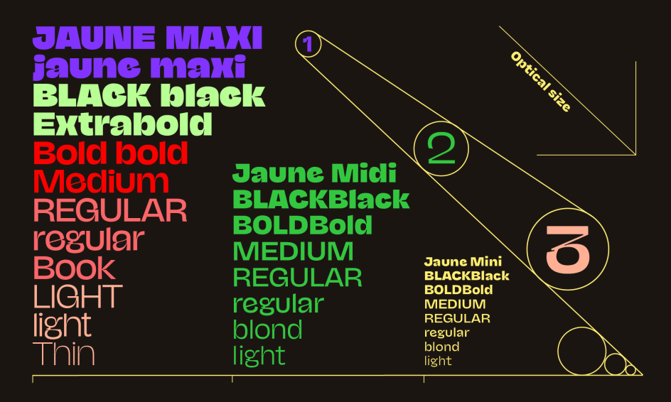 With Maxi, Midi and Mini subfamilies, NaN Jaune is crafted to suit any application or scale – from display type to long texts – working successfully and effortlessly every step of the way.