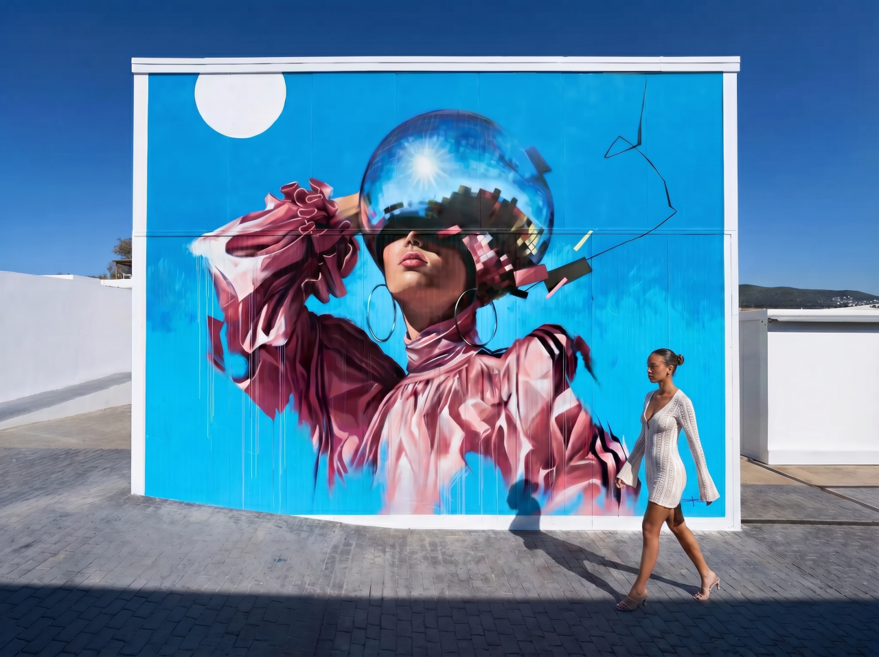 Pascale Sender's work at the main Hï Ibiza entrance combines physical painting with projection mapping to create a digital animation sequence. The exterior walls feature two 10m-high murals: one by PichiAvo, whose "Urban Mythology" style merges classical sculpture with contemporary graffiti culture, and another by UK artist .EPOD.