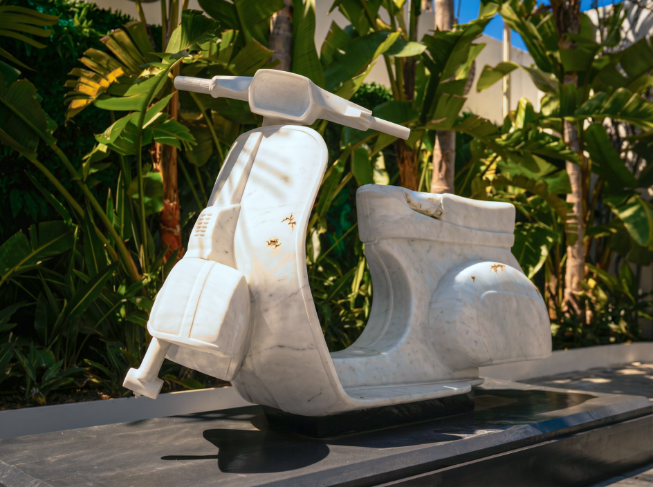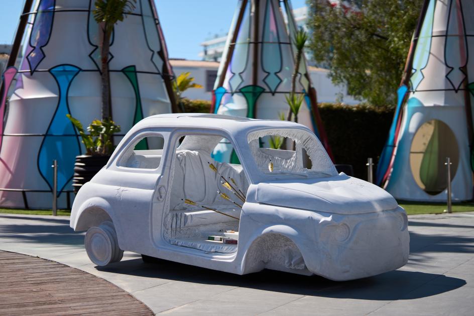 Nazareno Biondo has contributed two of the exhibition's most conversation-stopping works: a life-size Fiat 500 and a Vespa. Each is hand-carved from a 15-tonne block of solid Carrara marble and took two years to complete. They sit in Hï Ibiza's Secret Garden, where visitors who might be there primarily for a DJ like CamelPhat or ANTS will wander past them and, almost inevitably, stop.