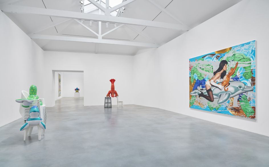 The exhibition is outlined in the gallery's statement: "Signalling the conception of one of Koons’s most enduring themes – the inflatable – it is here presented alongside a number of his iconic Hoover sculptures. Part of The New series (1980–1983), the wall-mounted Hoovers – in which immaculate, unused household appliances are displayed in fluorescent-lit, acrylic boxes – date from Koons’ time working as a Wall Street commodities broker.