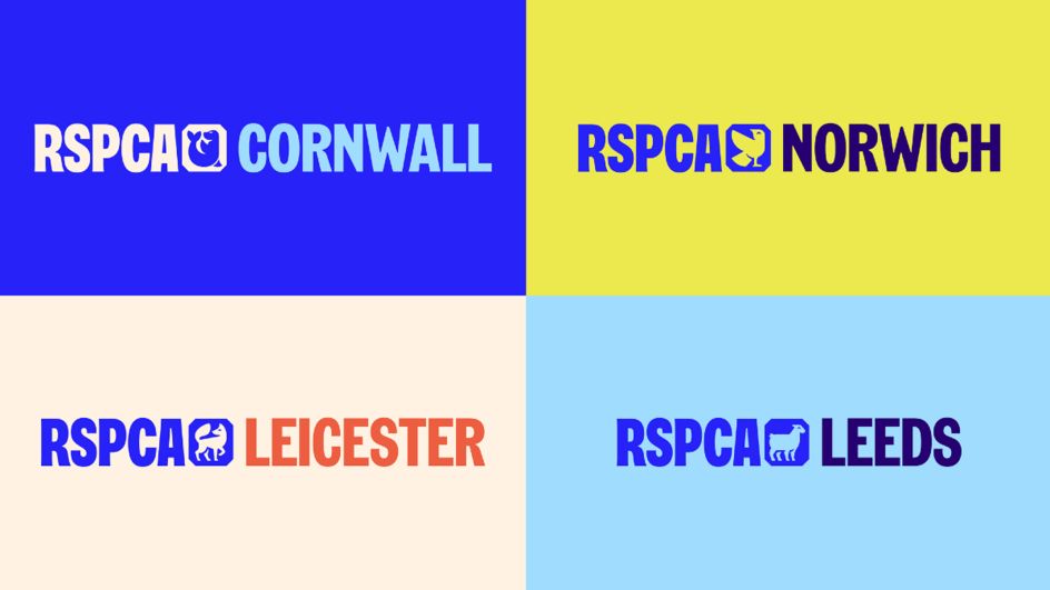 Animal iconography also features across the new brands, with an animal reflective of the regional wildlife matched up to each location. Cornwall appears in blue alongside a seal icon, while Norwich is splashed in yellow with a bird species (presumably the yellow canary that also appears on the town's football club identity). These icons and regional titles in the new typeface will appear on RSPCA shop fronts in large lettering, made in association with Studio Drama.