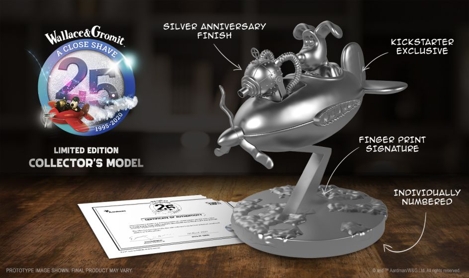 In celebration of the silver anniversary of Wallace & Gromit: A Close Shave, its original animation studio Aardman has partnered with Bristol memorabilia makers The Vine Lab on an exclusive collectors' model being funded via Kickstarter. Depicting one of the most iconic scenes from the classic short film, the highly detailed, silver-effect model will depict the moment that Gromit flies into the air in his sidecar plane.