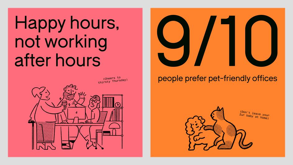 The uppercase treatment of the type is fresh and gutsy, swinging open when animated as a nod to Glassdoor's name. Working closely alongside Amber Weaver at TYPE01, Koto partnered with Giulia Boggio to create a custom typeface called Glassdoor Sans, a geometric sans-serif that features quirky characteristics inspired by office vernacular.
