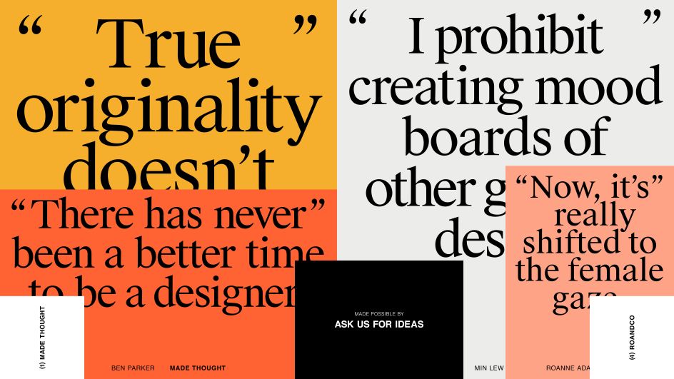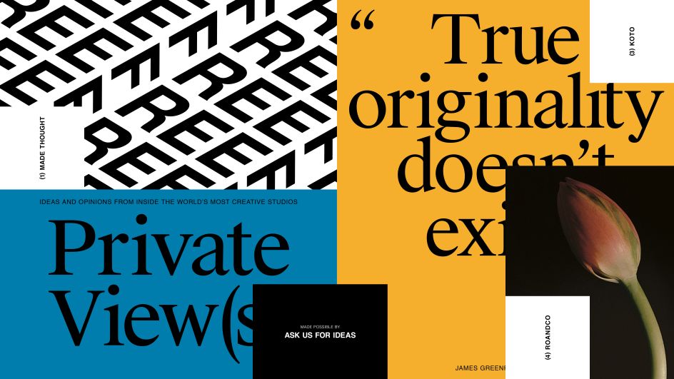 Made Thought, RoAndCo, Collins, Base Design, Koto, AllOfUs, DesignStudio, Gretel, Mythology and Character all feature in Private View(s), ten insightful episodes created by Ask Us For Ideas (AUFI), a client-creative matchmaking agency, in collaboration with producer David Michon.
