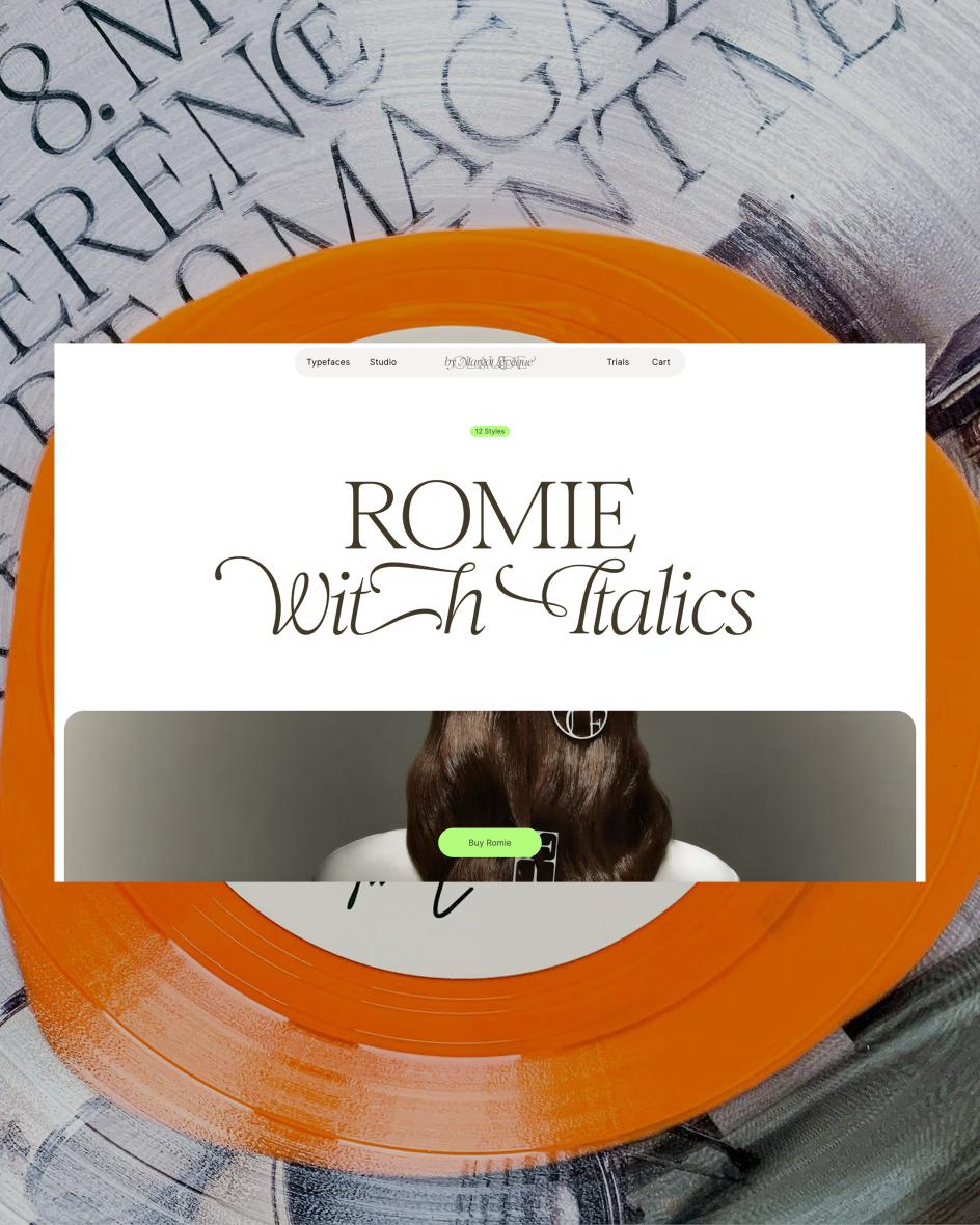 The dual tribute tells you a great deal about how Margot thinks. She moves between the historical and the personal, the monumental and the intimate, and finds the distance between them smaller than you might expect. "As a student, I kept coming back to Garamond again and again, but over time it started to feel a little too distant," she recalls. "I felt the need to get closer, to touch that heritage and gently shape it, to let my own voice exist within it: that's why I created Romie."